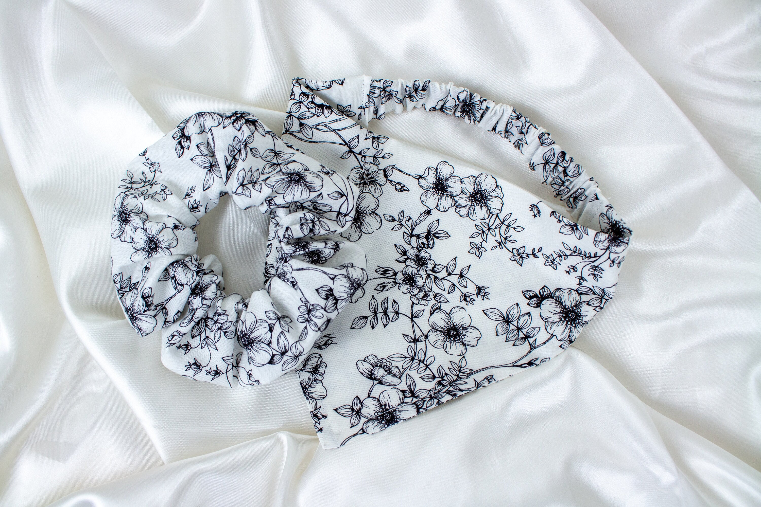 🥰This set lets you match your pet and walk around town looking cute together! This matching pet bandana and hair scrunchie are handmade from quality white fabric with a beautiful, ornate black floral pattern!