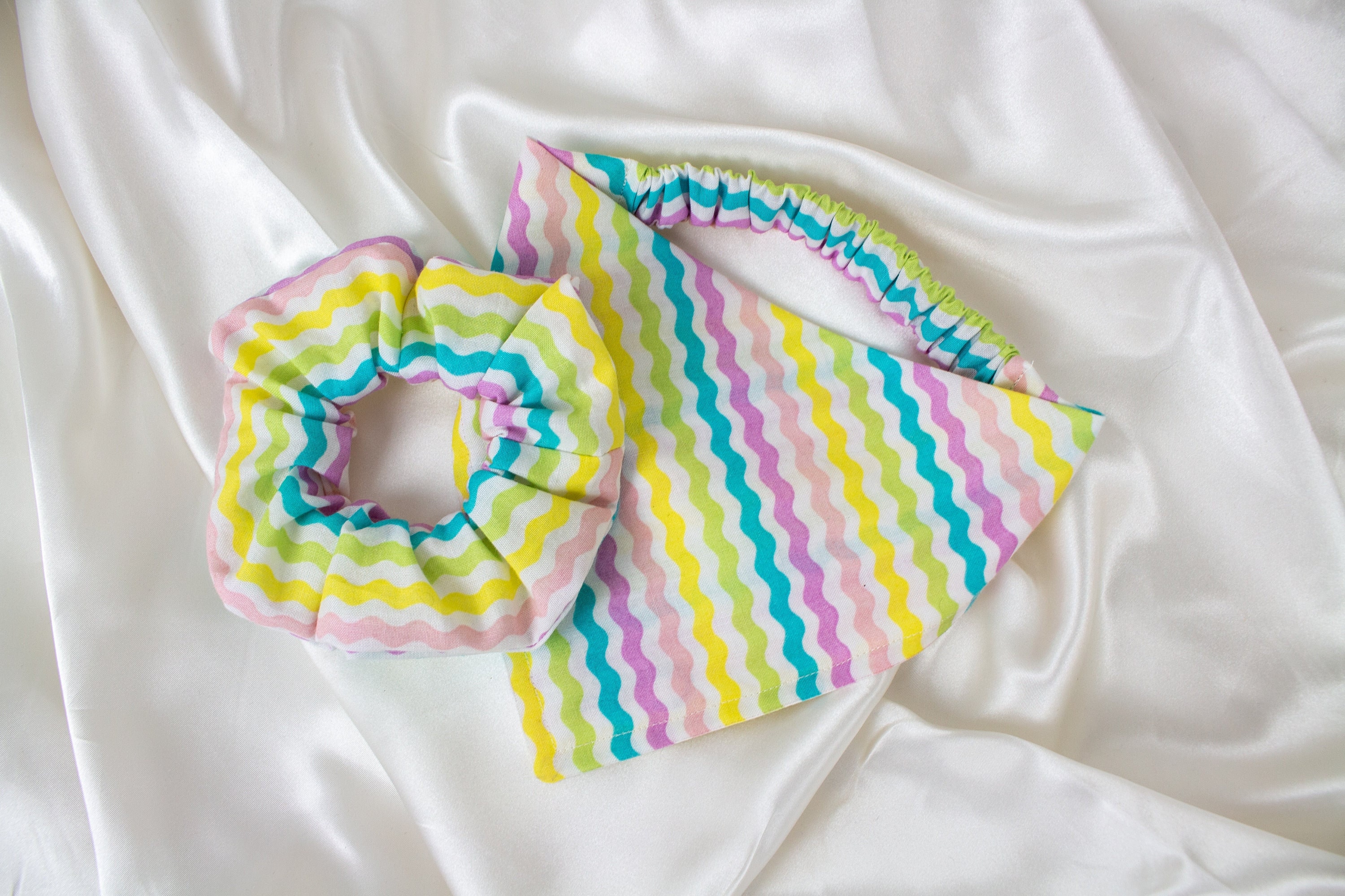 🥰This set lets you match your pet and walk around town looking cute together! This matching pet bandana and hair scrunchie are handmade from quality white fabric with a pattern of pastel Easter-themed stripes!
