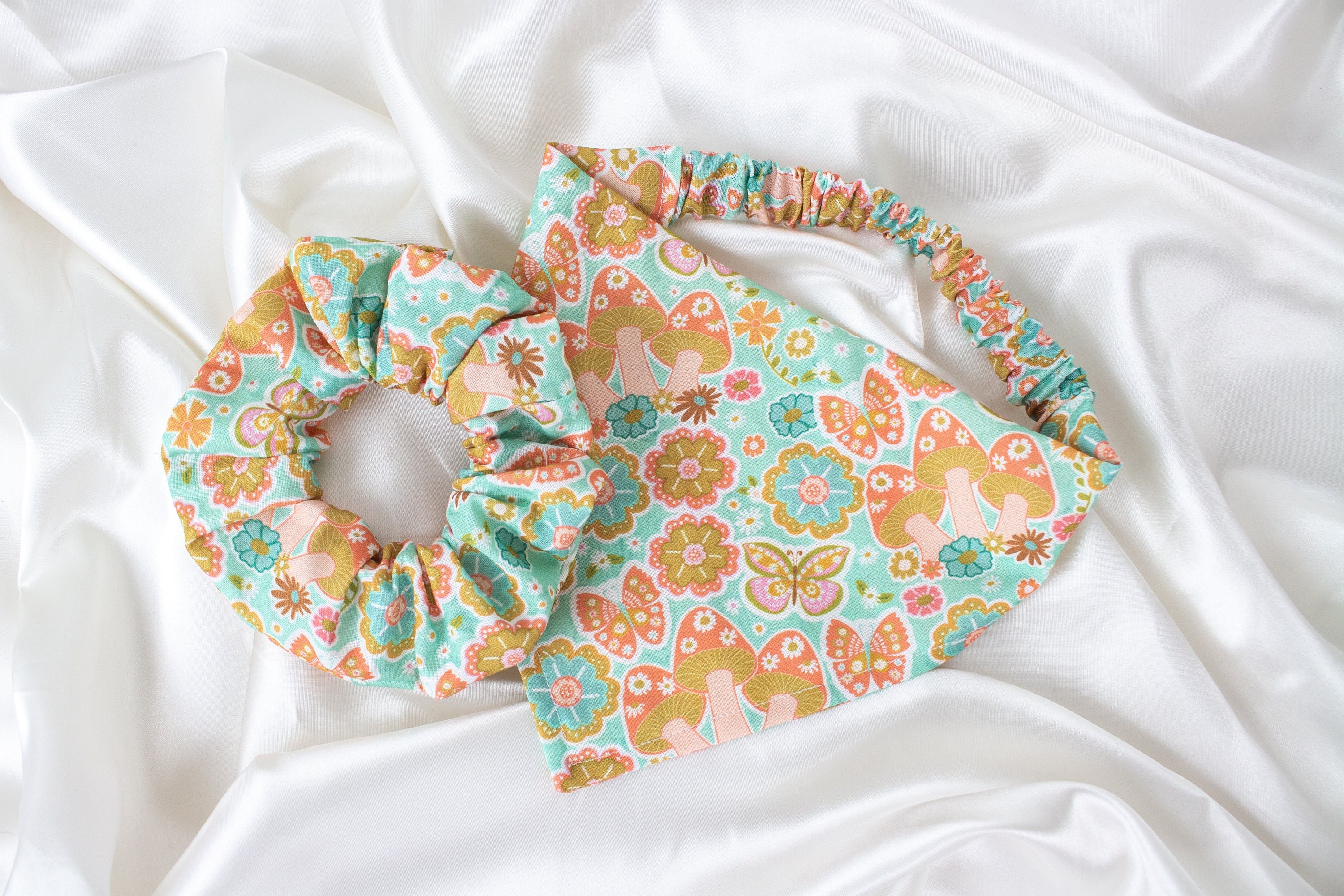 🥰This set lets you match your pet and walk around town looking cute together! This matching pet bandana and hair scrunchie are handmade from quality fabric with a cool retro '60s pattern with mushrooms and beautiful butterflies!