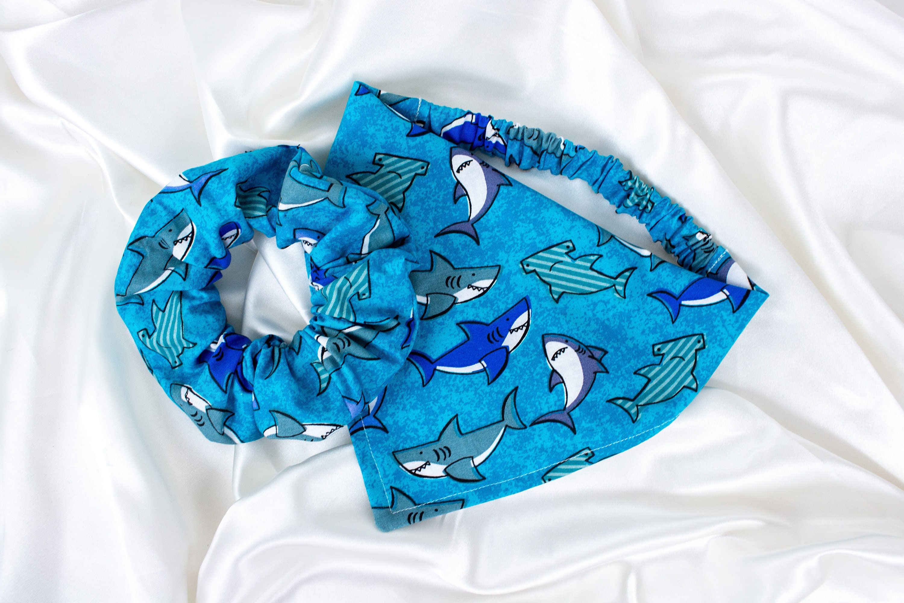🥰This set lets you match your pet and walk around town looking cute together! This matching pet bandana and hair scrunchie are handmade from quality rich blue fabric with adorable, cute little baby sharks!