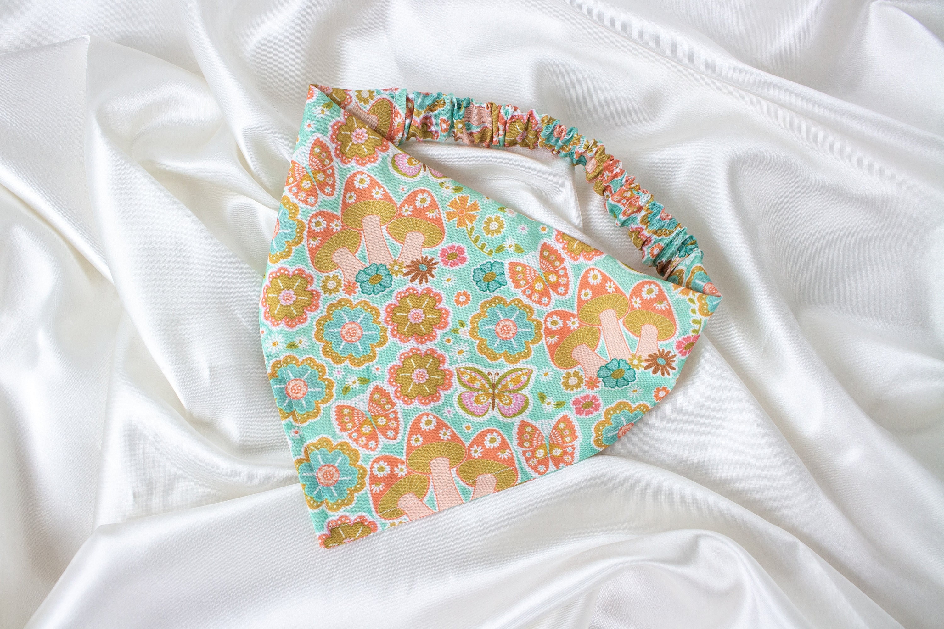 🥰This pet bandana is handmade from quality fabric with a cool retro '60s pattern with mushrooms and beautiful butterflies! It features an elastic strap to make it easier to get on and off your pet!
