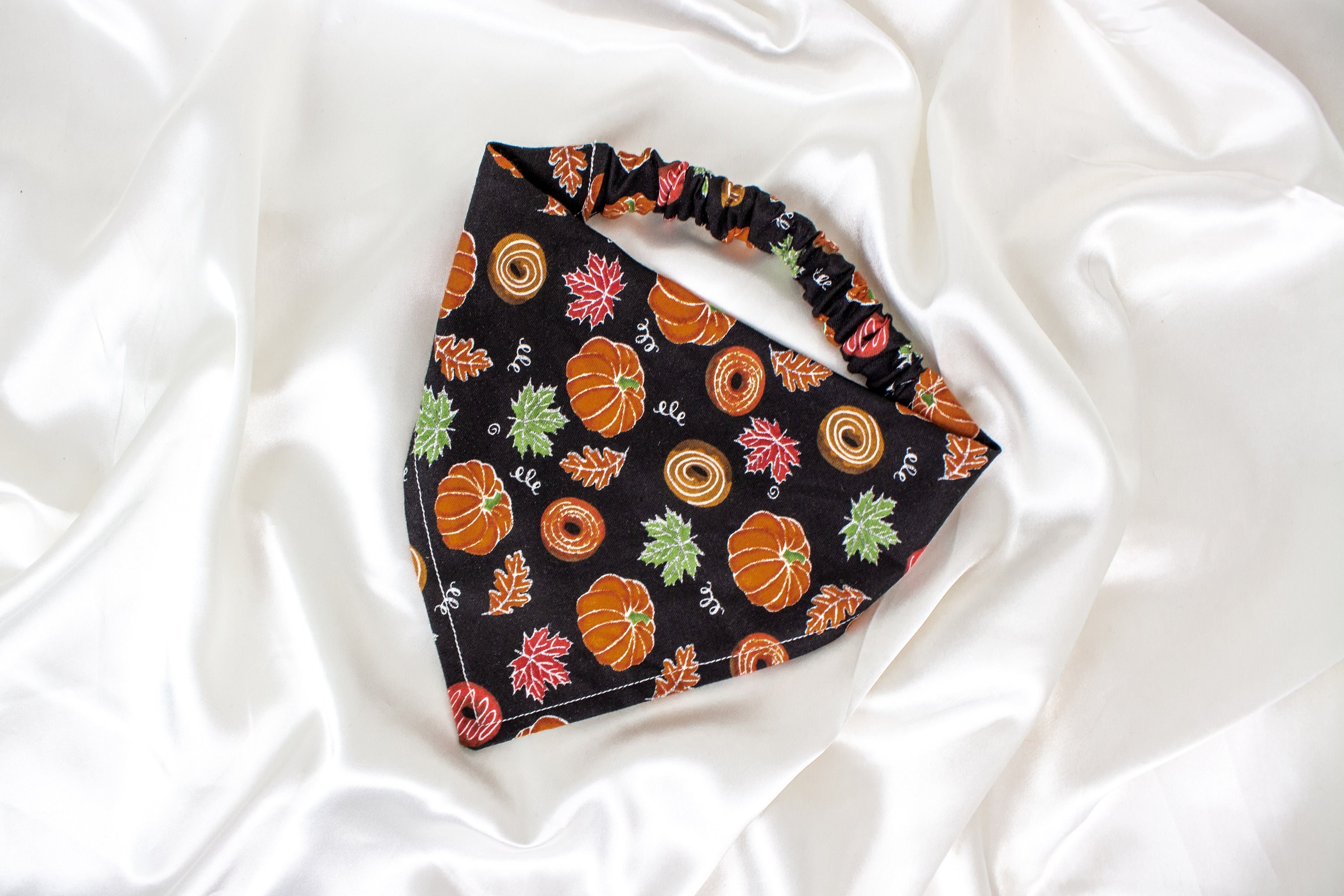 🥰This pet bandana is handmade from quality fabric that has a black color and a beautiful fall-themed pattern with pumpkins and autumn leaves! It features an elastic strap to make it easier to get on and off your pet!