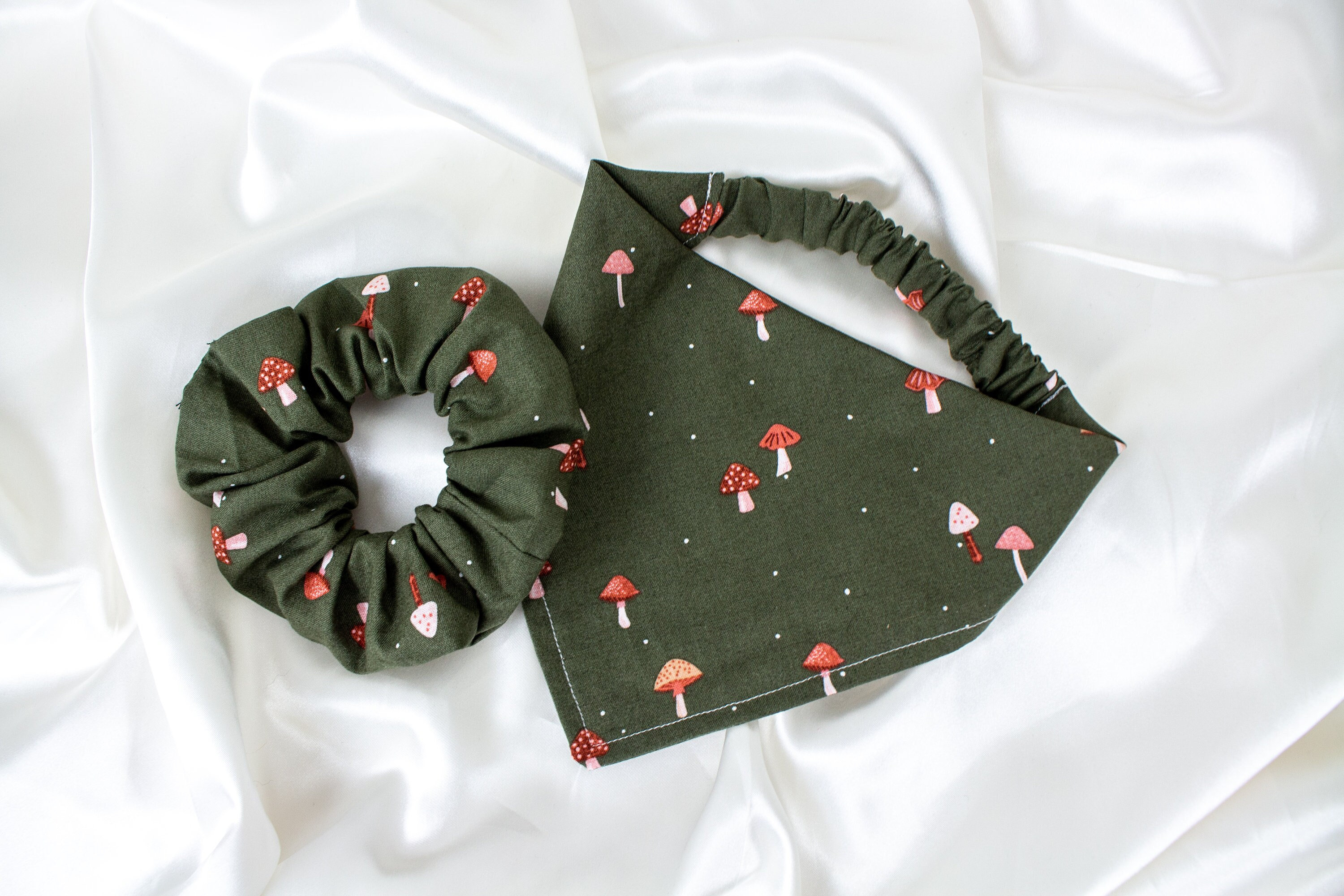 MATCHING Woodland Mushroom Dog Bandana and Hair Scrunchie Set, Fall Scrunchies Pet and Owner Set, Autumn Scrunchy and Dog Scarf, Dog Gift