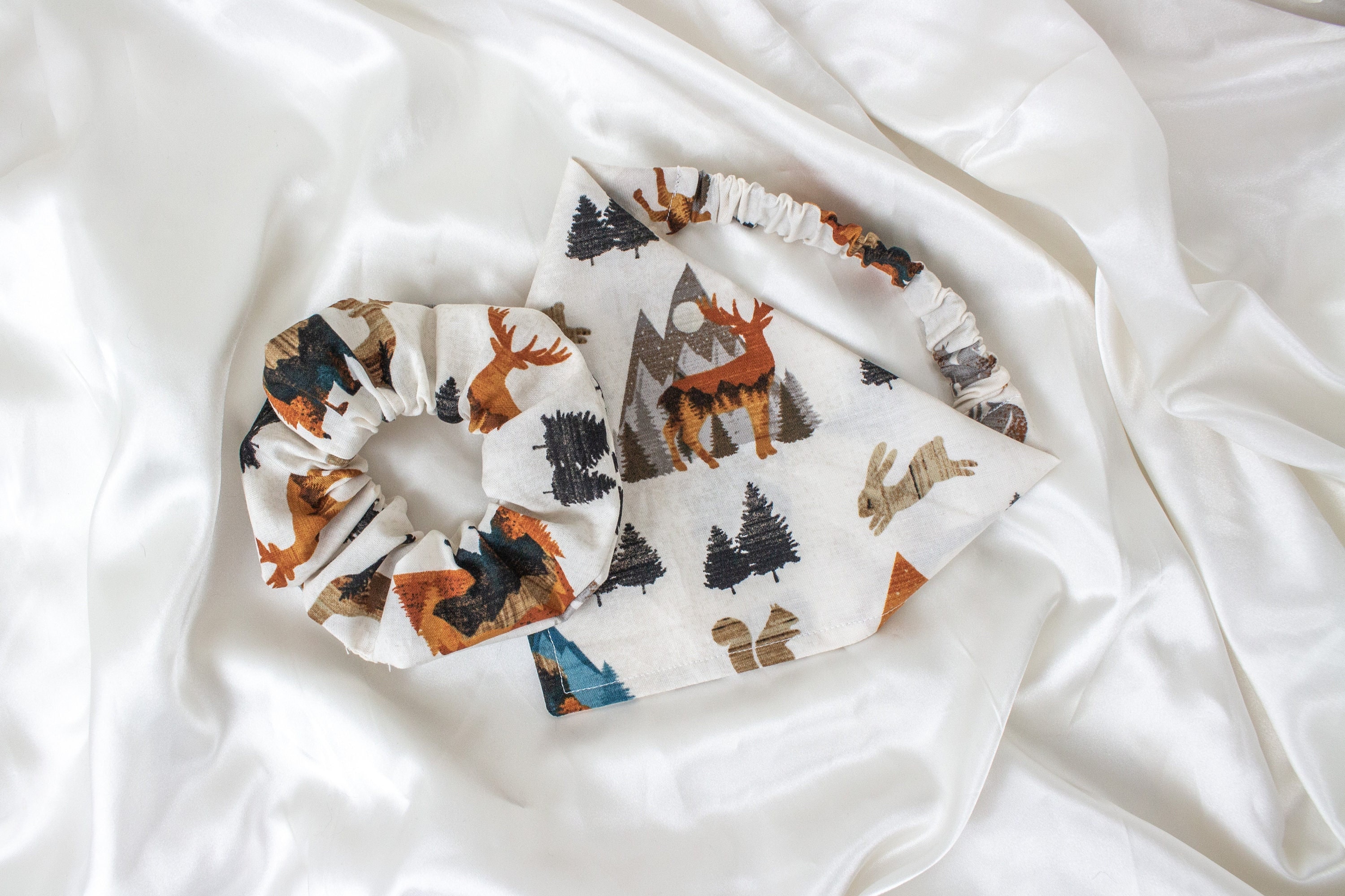 🥰This set lets you match your pet and walk around town looking cute together! This matching pet bandana and hair scrunchie are handmade from quality creamy white fabric with an outdoor woodland pattern showing mountains, trees, rabbits, squirrels, deer, bears, and foxes!