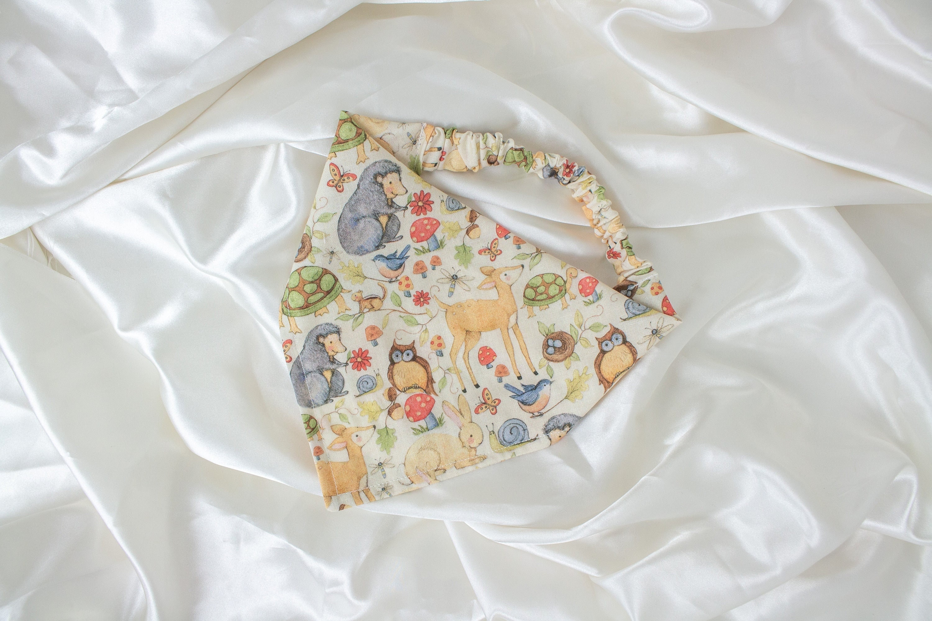 🥰This pet bandana is handmade from quality cream-colored fabric with a pattern of sweet, cute, adorable woodland animals: deer, owls, bunny rabbits, snails, turtles, and pretty butterflies! And mushrooms, too! This pattern is very gentle, subtle, and calming!