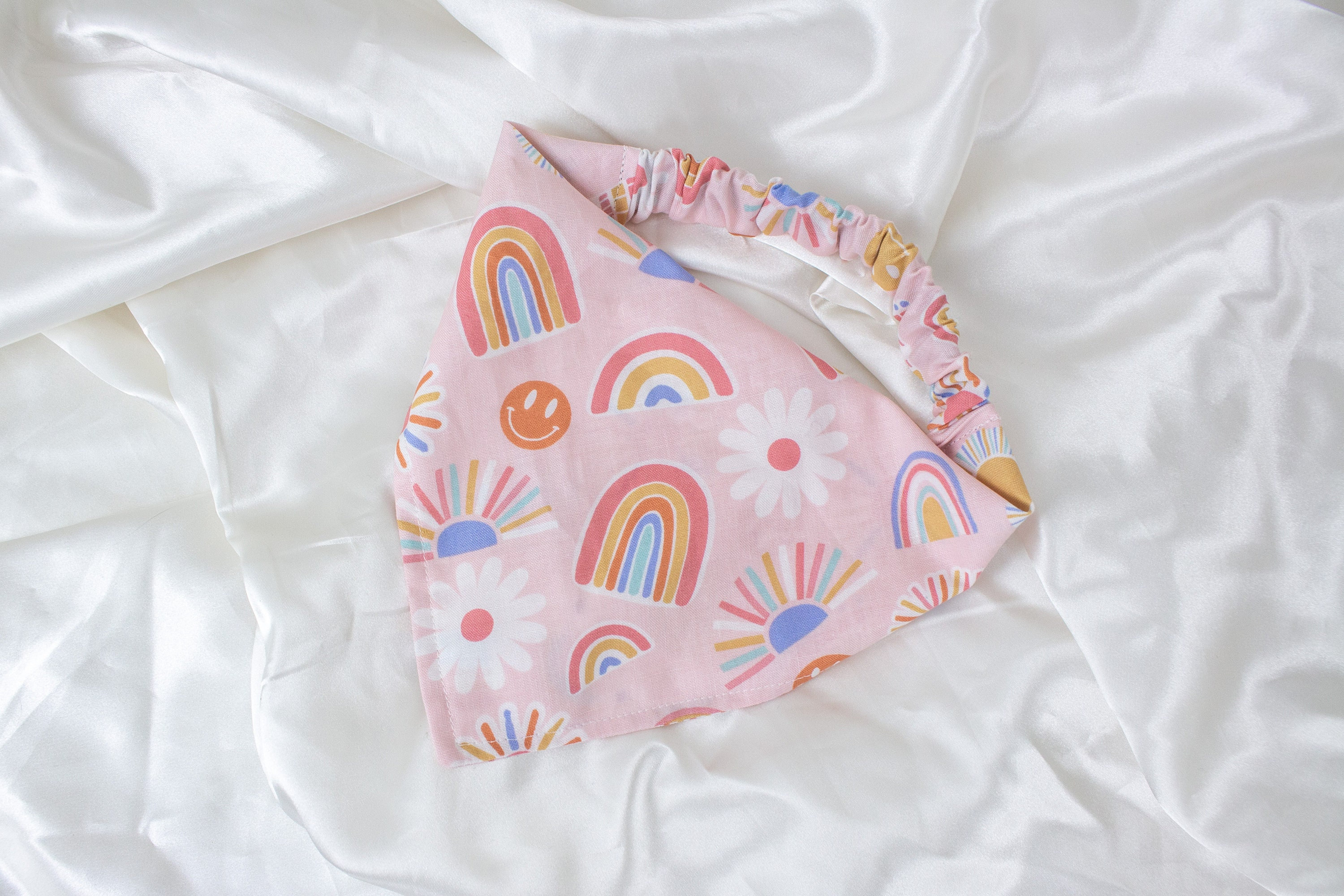 🥰This pet bandana is handmade from quality subtle pink fabric with a retro, groovy design of smiley faces, rainbows, and daisies! It features an elastic strap to make it easier to get on and off your pet!