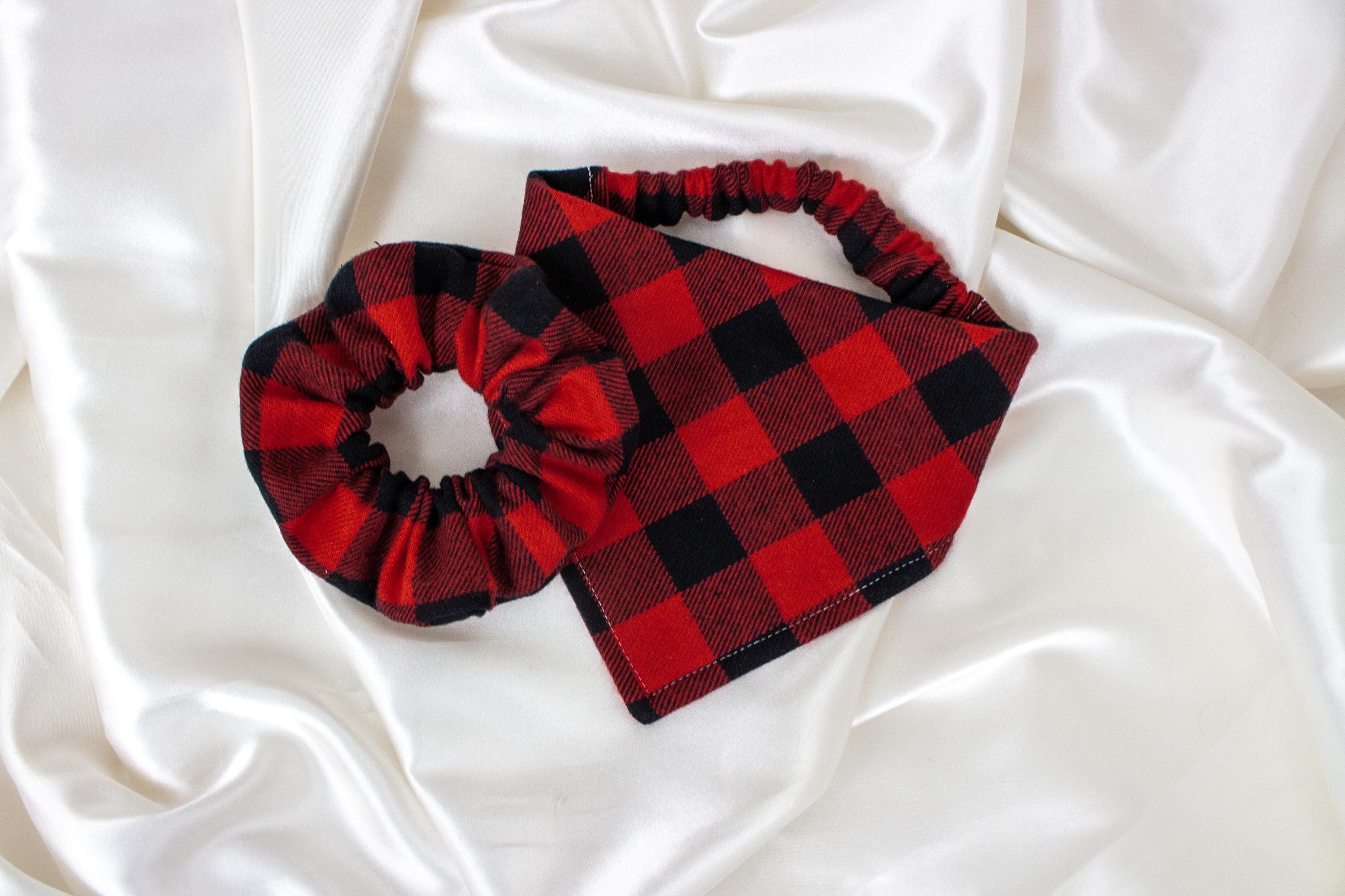 🥰This set lets you match your pet and walk around town looking cute together! This matching pet bandana and hair scrunchie are handmade from quality soft, cozy flannel fabric that is a red and black buffalo plaid pattern!