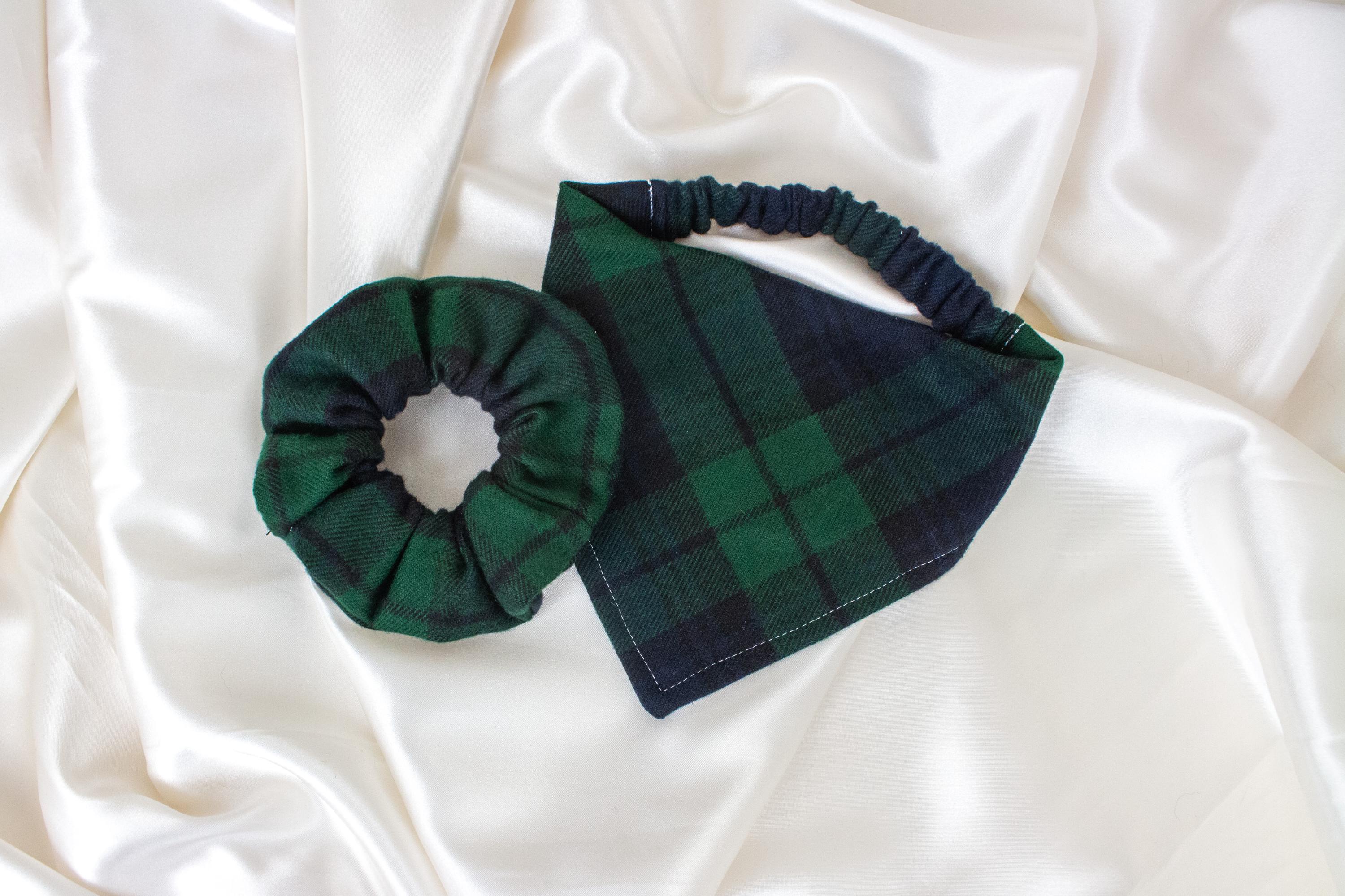 🥰This set lets you match your pet and walk around town looking cute together! This matching pet bandana and hair scrunchie are handmade from quality soft, cozy flannel fabric that is a rich, dark green color and has a plaid pattern!