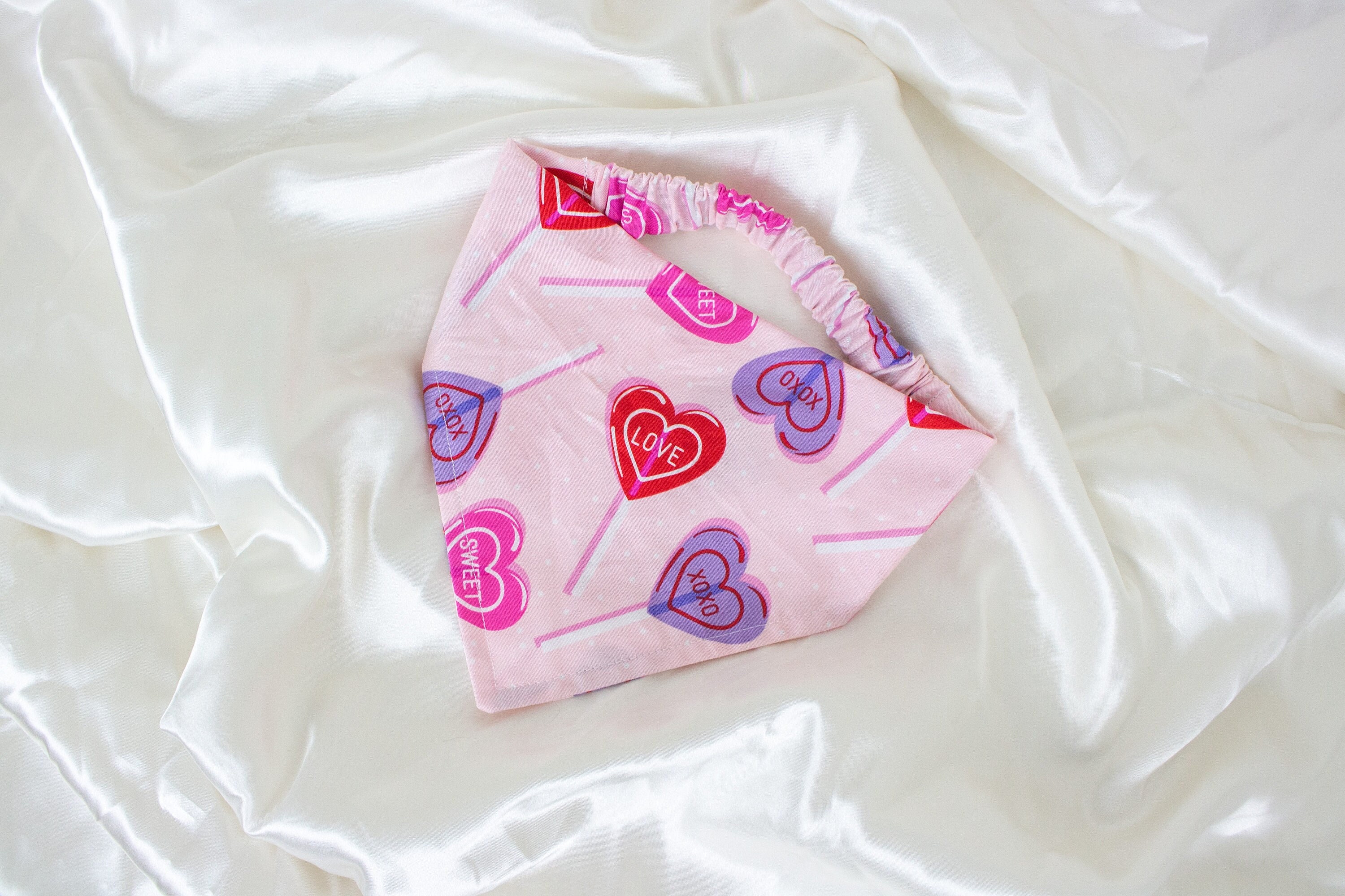 🥰This pet bandana is handmade from quality pink fabric with cute Valentine lollipops and subtle white polka dots! It features an elastic strap to make it easier to get on and off your pet!
