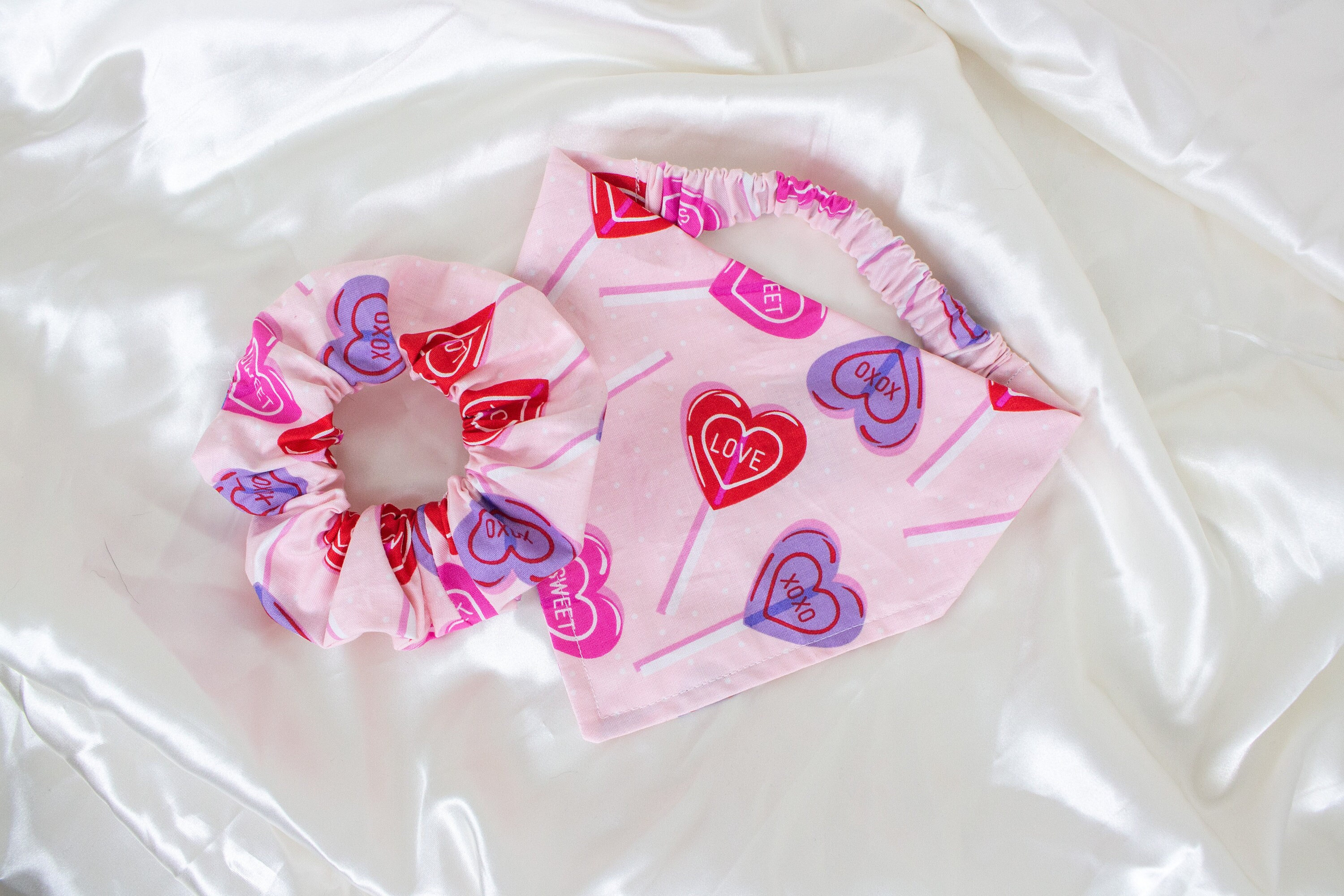 Cute Valentines Day Matching Dog Bandana and Hair Scrunchie Set, Heart Lollipop Pet and Owner Set, Pink Valentines Day Gifts, Dog Scarf