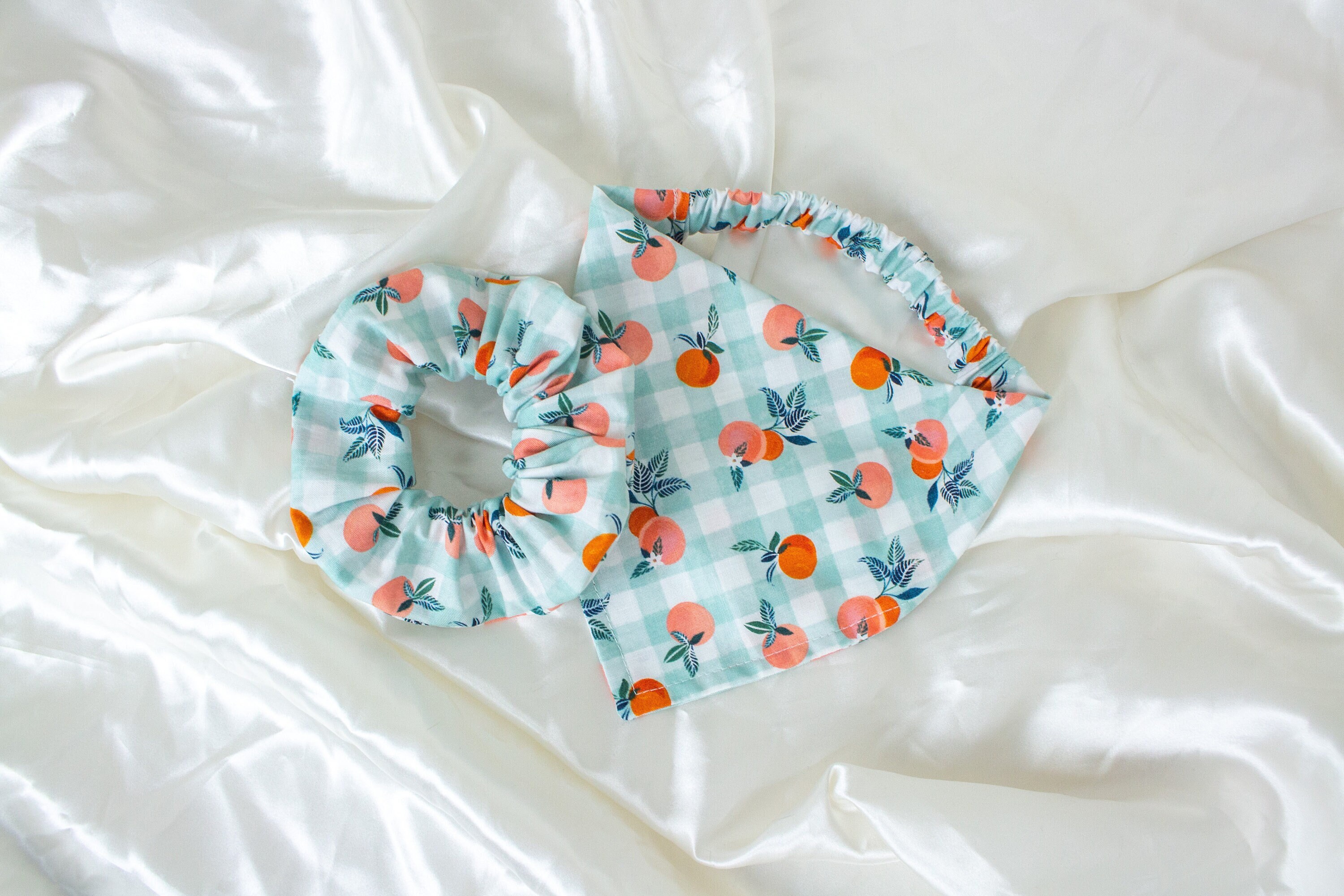 MATCH YOUR DOG! Plaid Oranges Slip On Dog Bandana and Hair Scrunchie Set, Gingham Scrunchy Pet and Owner Set, Scrunchies and Dog Scarf