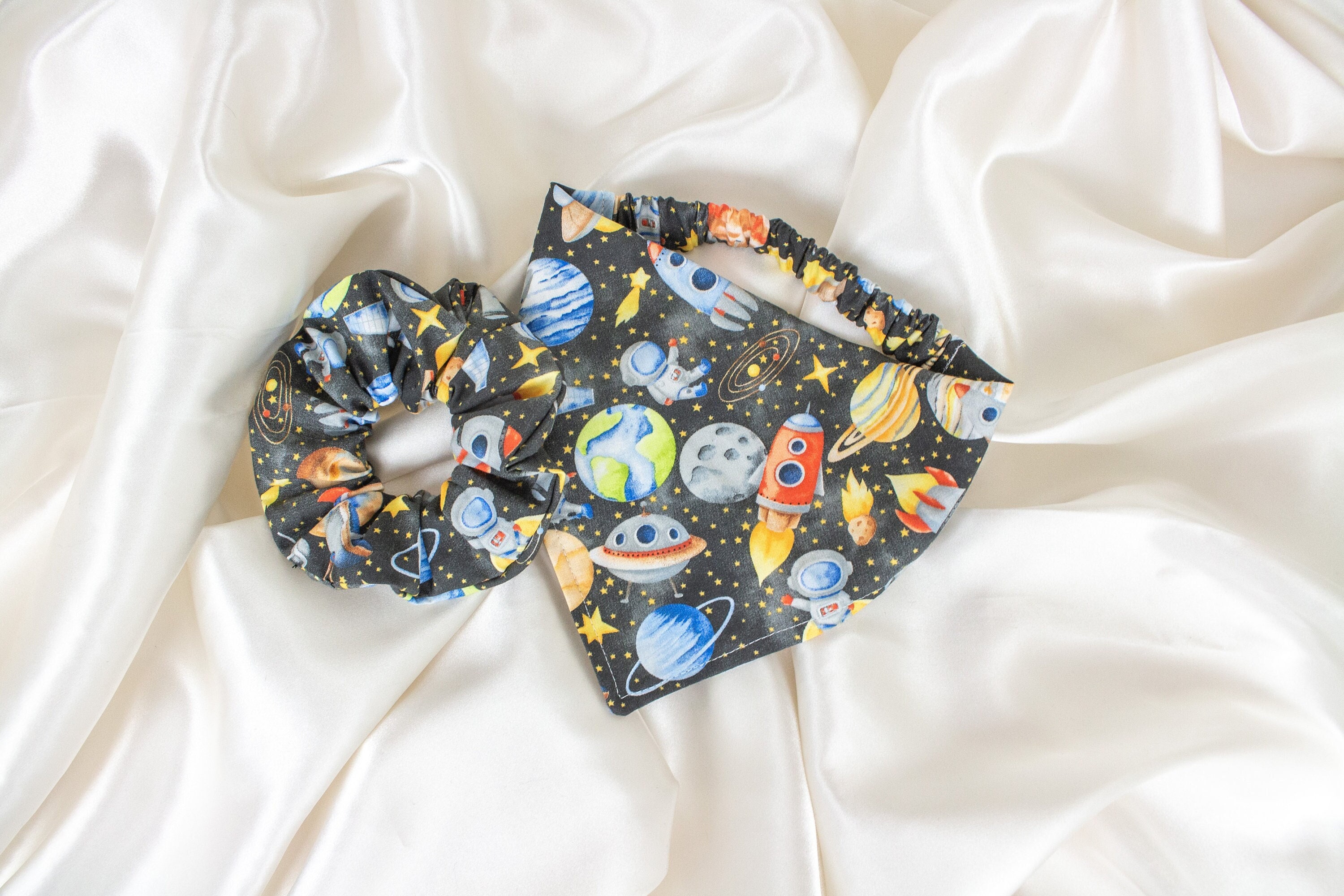Matching Retro Outer Space Dog Bandana and Hair Scrunchie Set, Dog Scarf and Scrunchy Matching Dog and Owner Pack, Dog Accessories Boy