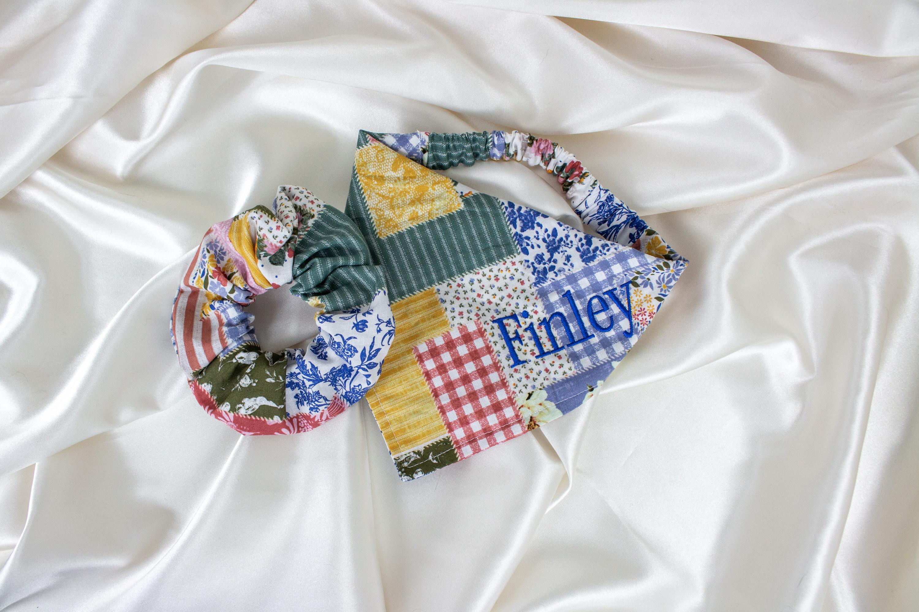 MATCHING Embroidered Personalized Dog Bandana and Hair Scrunchie Set, Patchwork Quilt Scrunchy Pet and Owner Set, Custom Dog Bandana