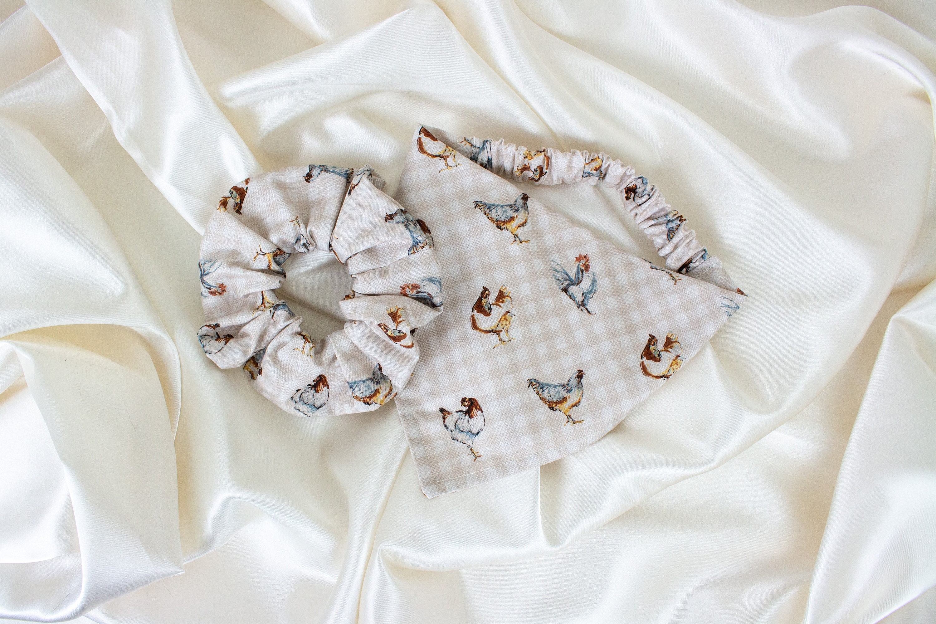 Matching Beige Gingham Dog Bandana and Hair Scrunchie Set with Chickens, Checkered Dog Scarf and Scrunchy Pack, Pet and Owner Set