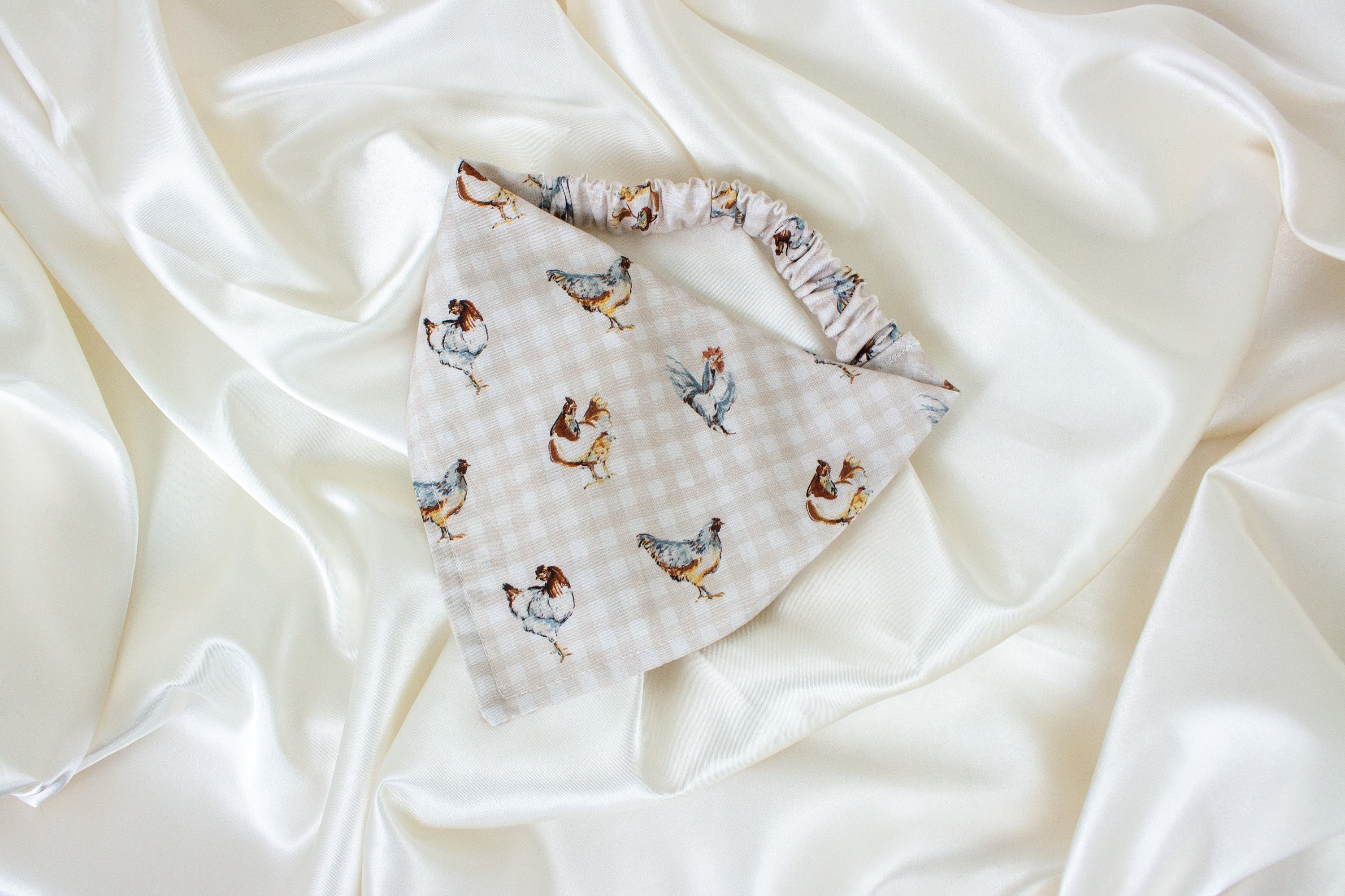 🥰This pet bandana is handmade from quality fabric with a beige gingham pattern and chickens! It features an elastic strap to make it easier to get on and off your pet!