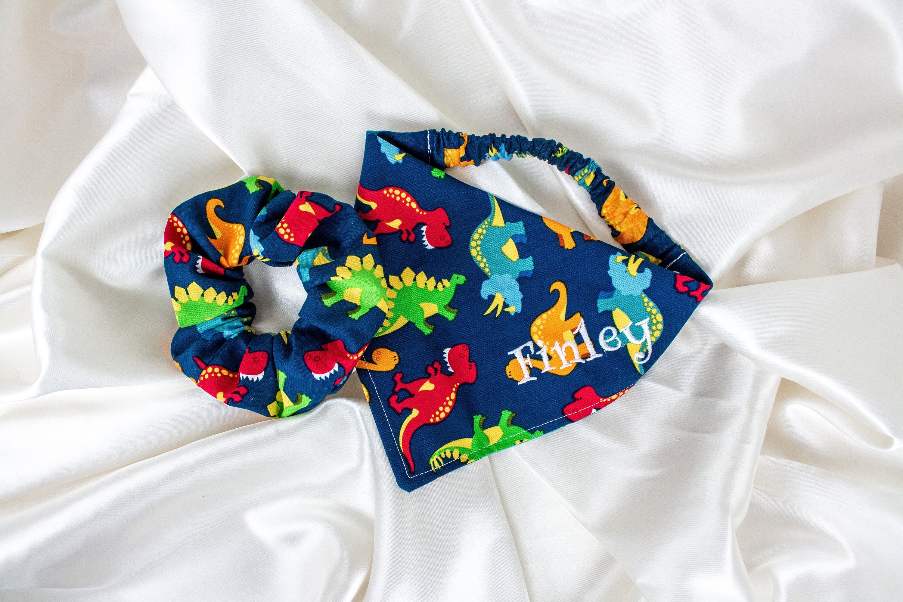 MATCHING Personalized Dog Bandana and Hair Scrunchie Set, Embroidered Dinosaur Scrunchy Pet and Owner Set, Dino Custom Dog Bandana Boy