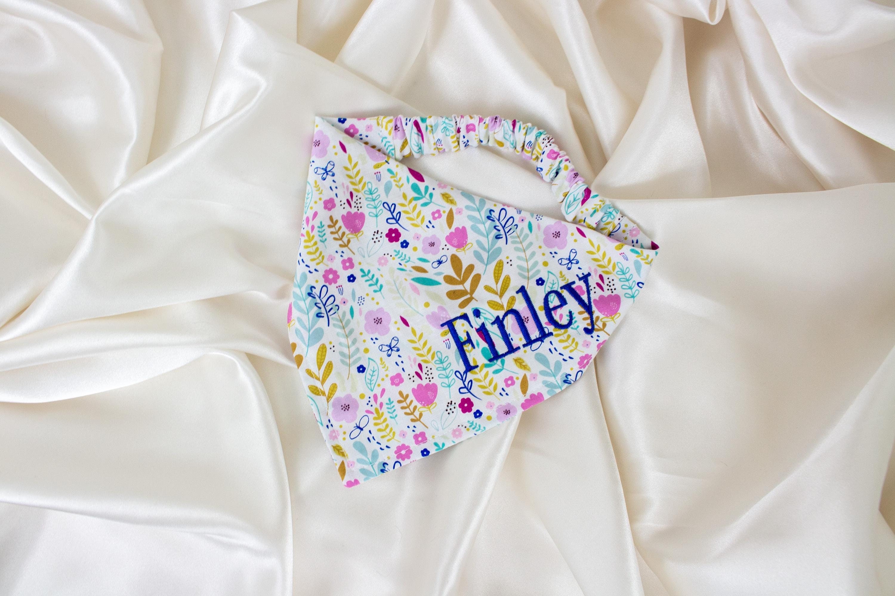 Embroidered Personalized Dog Bandana, White Floral Dog Bandana, Custom Dog Scarf, Custom Name Puppy Bandana with Flowers
