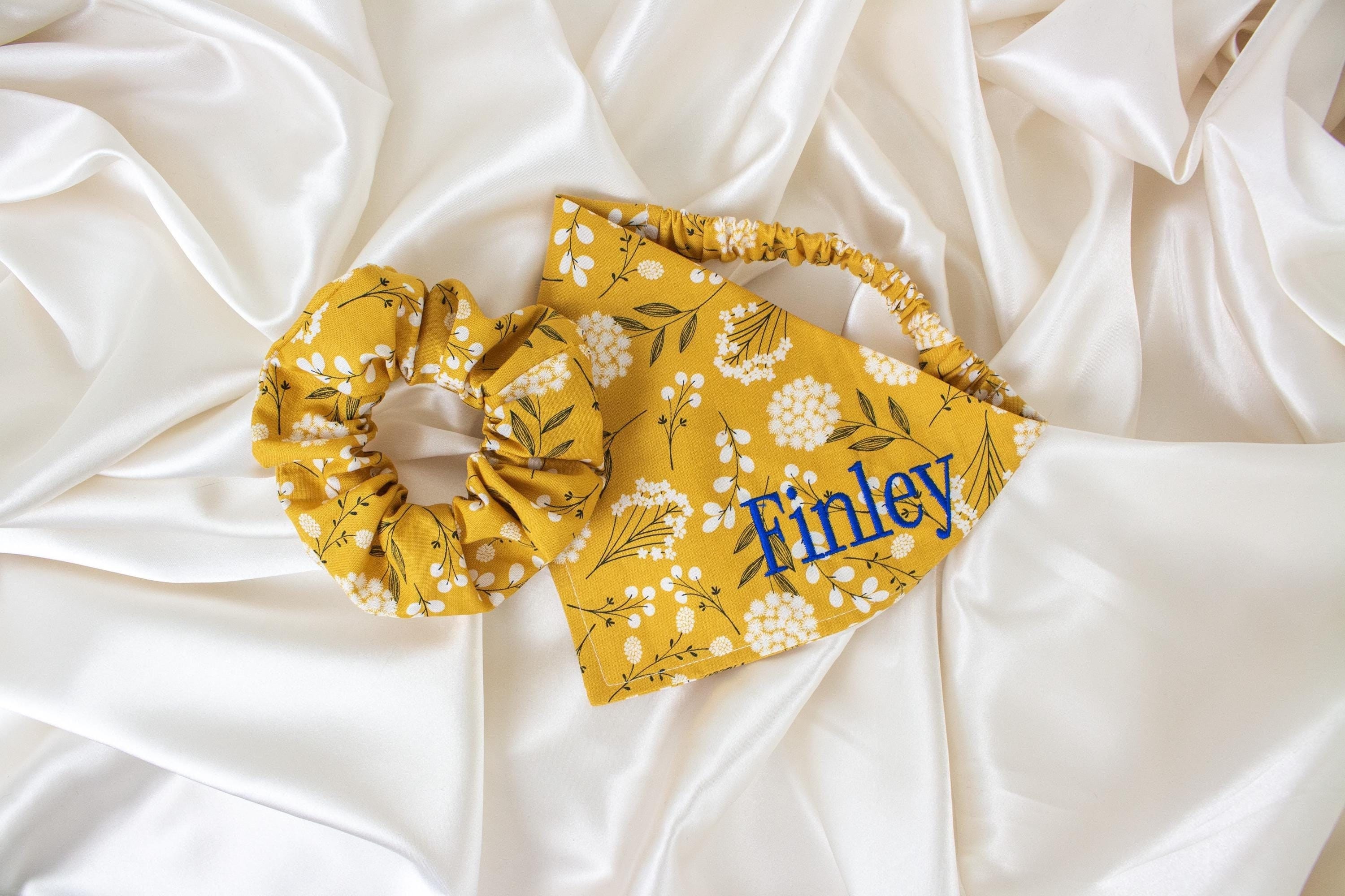 MATCHING Personalized Dog Bandana and Hair Scrunchie Set, Mustard Floral Scrunchy Pet and Owner Set, Embroidered Custom Dog Bandana Pack