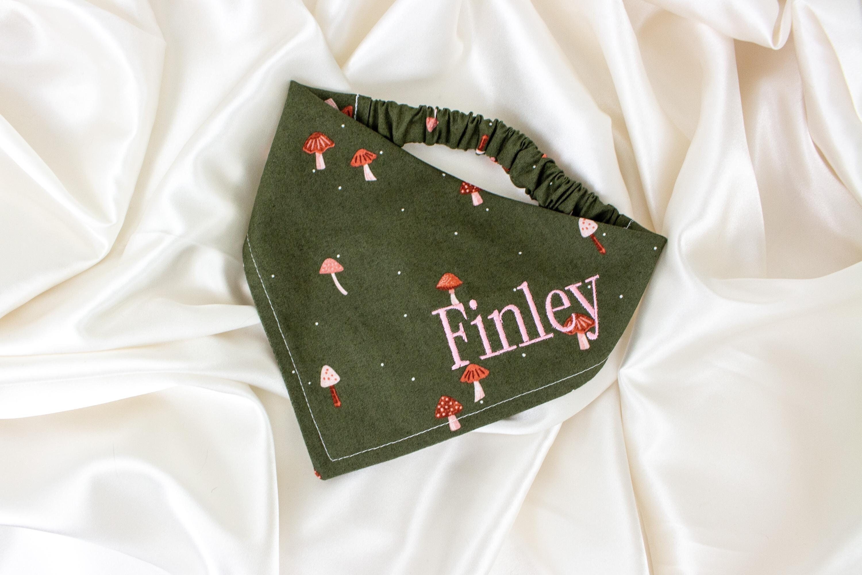 Embroidered Personalized Dog Bandana, Woodland Mushroom Dog Bandana, Forest Green Dog Scarf for Fall, Fall Pet Handkerchief, Custom Name
