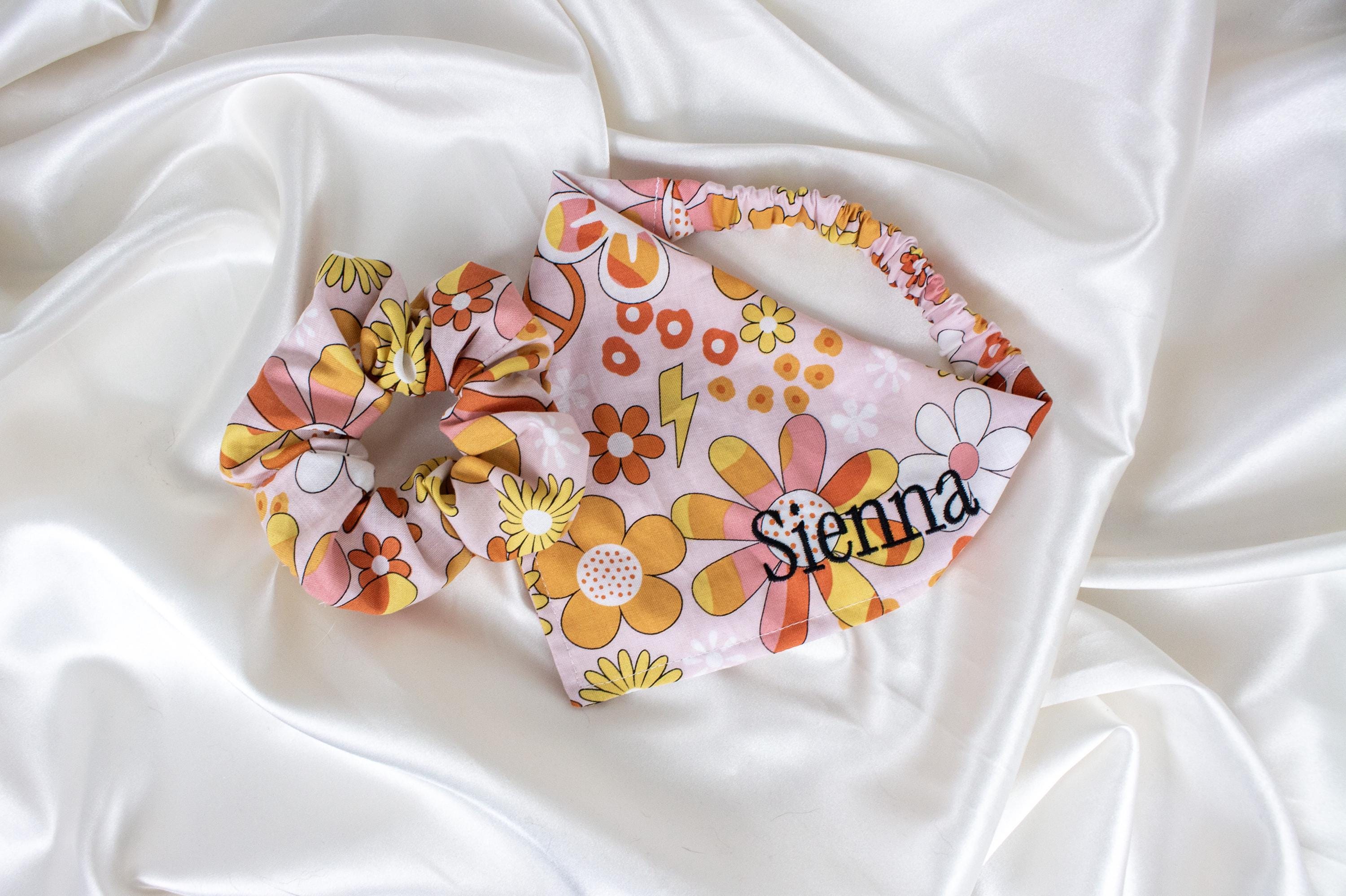 Matching Embroidered Personalized Dog Bandana and Hair Scrunchie Set, Retro Daisy Custom Name Scrunchy Matching Pet and Owner Pack, Groovy