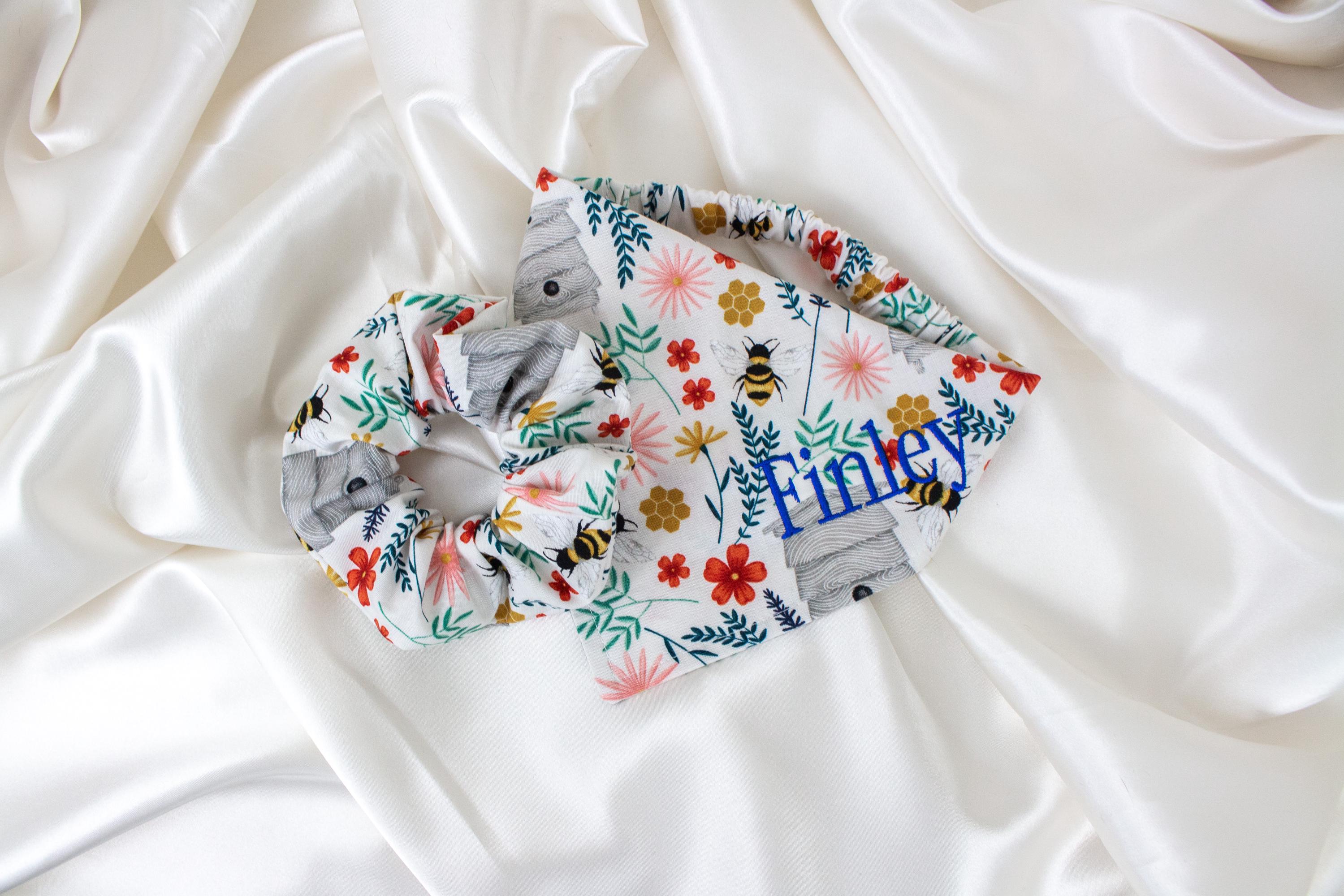 MATCHING Floral Bee Personalized Dog Bandana and Hair Scrunchie Set, Embroidered, Custom Name Dog Scarf, Bumble Bee Pet and Owner Pack