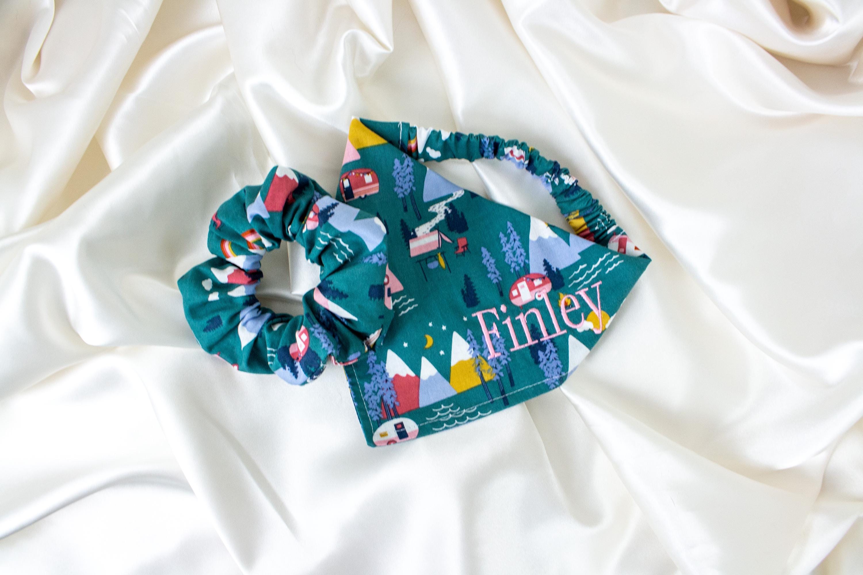 MATCHING Personalized Dog Bandana and Hair Scrunchie Set, Camping Adventure Dog Scarf, Embroidered Custom Name, Summer, Pet and Owner
