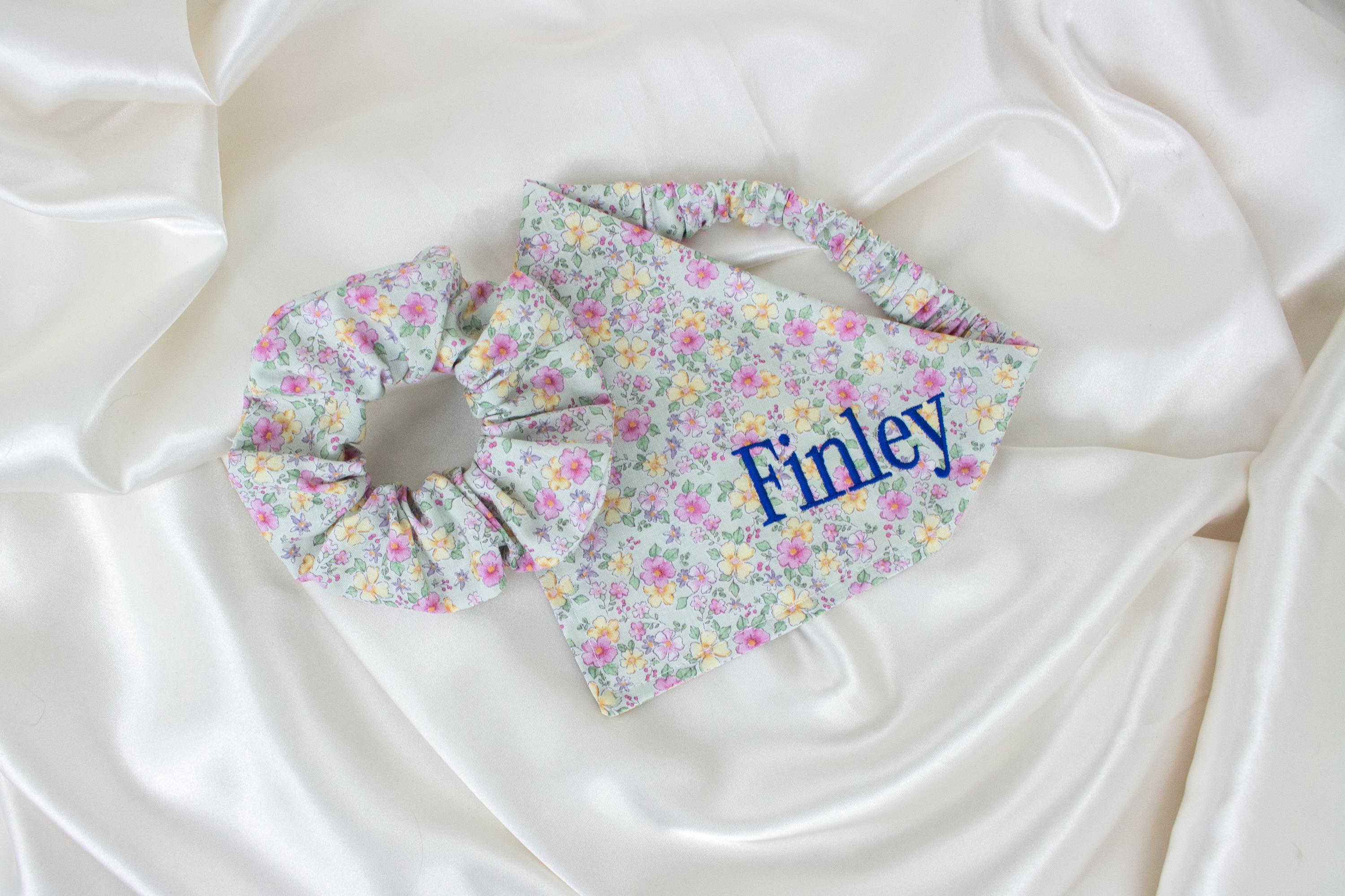 MATCH YOUR DOG! Sage Floral Personalized Dog Bandana and Hair Scrunchie Set, Embroidered Pet and Owner Pack, Custom Name Dog Bandana