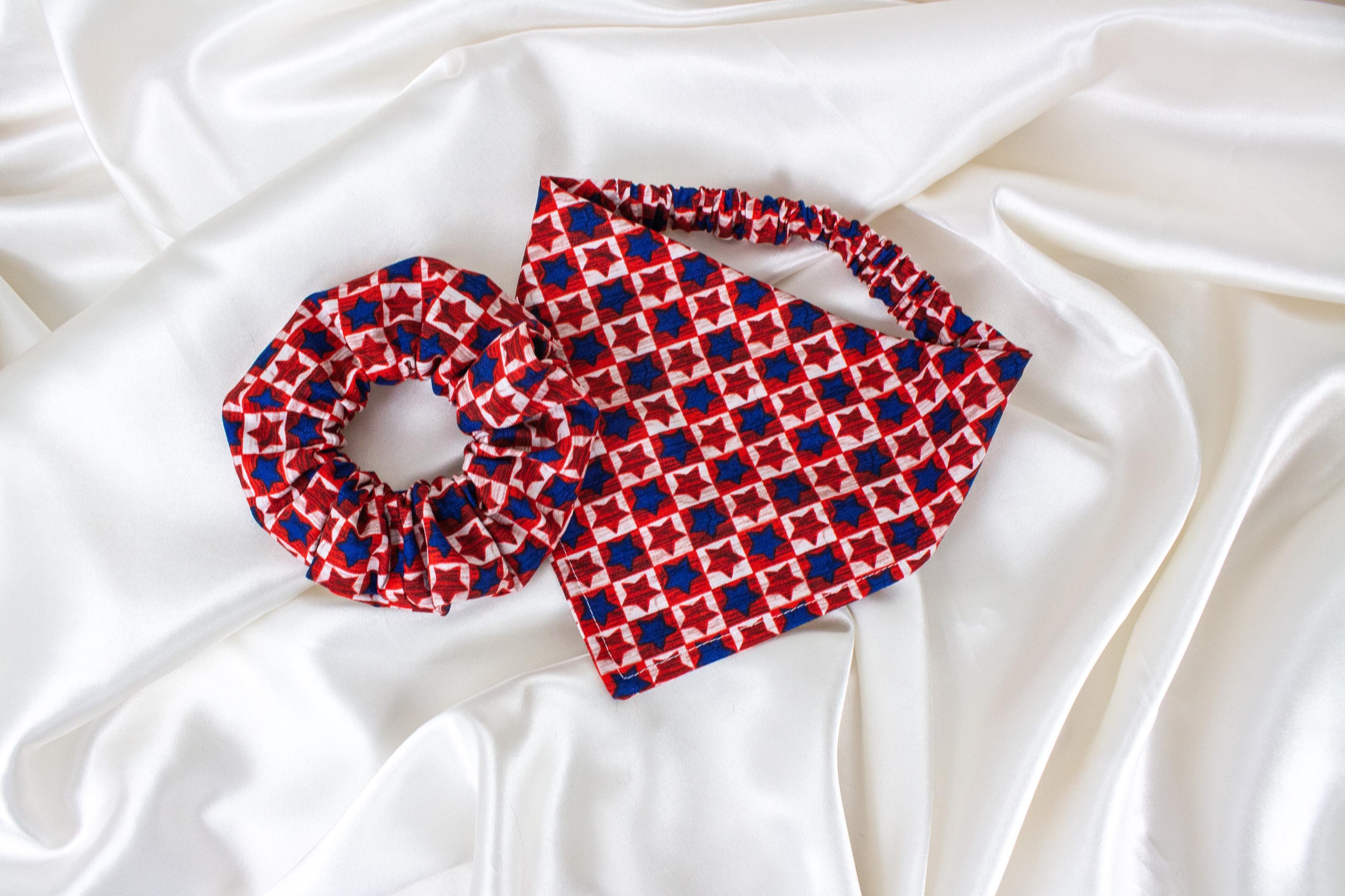 Matching Rustic Patriotic Dog Bandana and Hair Scrunchie Set, 4th of July Stars, Checkered Dog Scarf and Scrunchy, Pet and Owner Pack