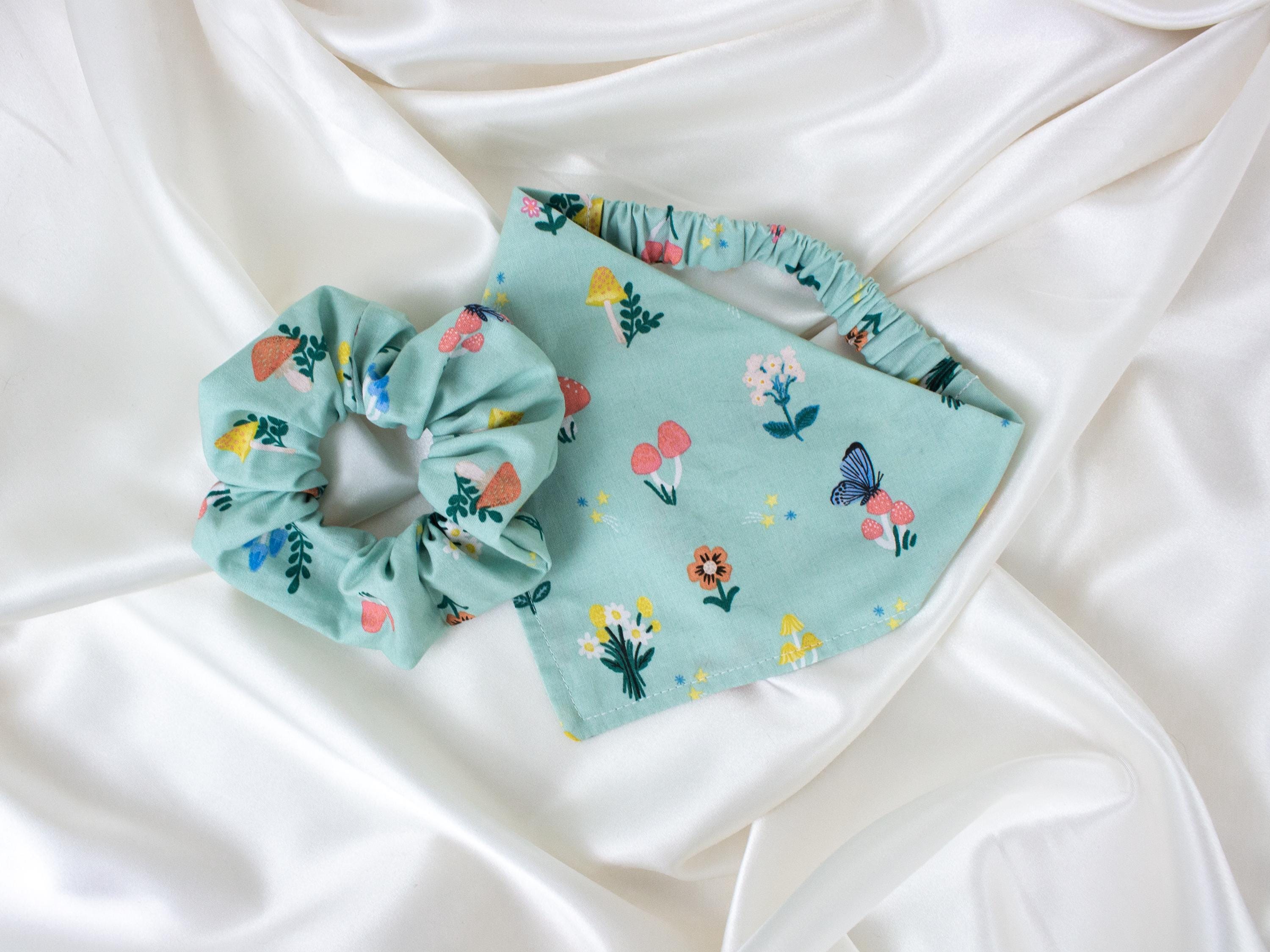 🥰This set lets you match your pet and walk around town looking cute together! This matching pet bandana and hair scrunchie are handmade from quality sage fabric that has a beautiful pattern of spring flowers, mushrooms, and butterflies!