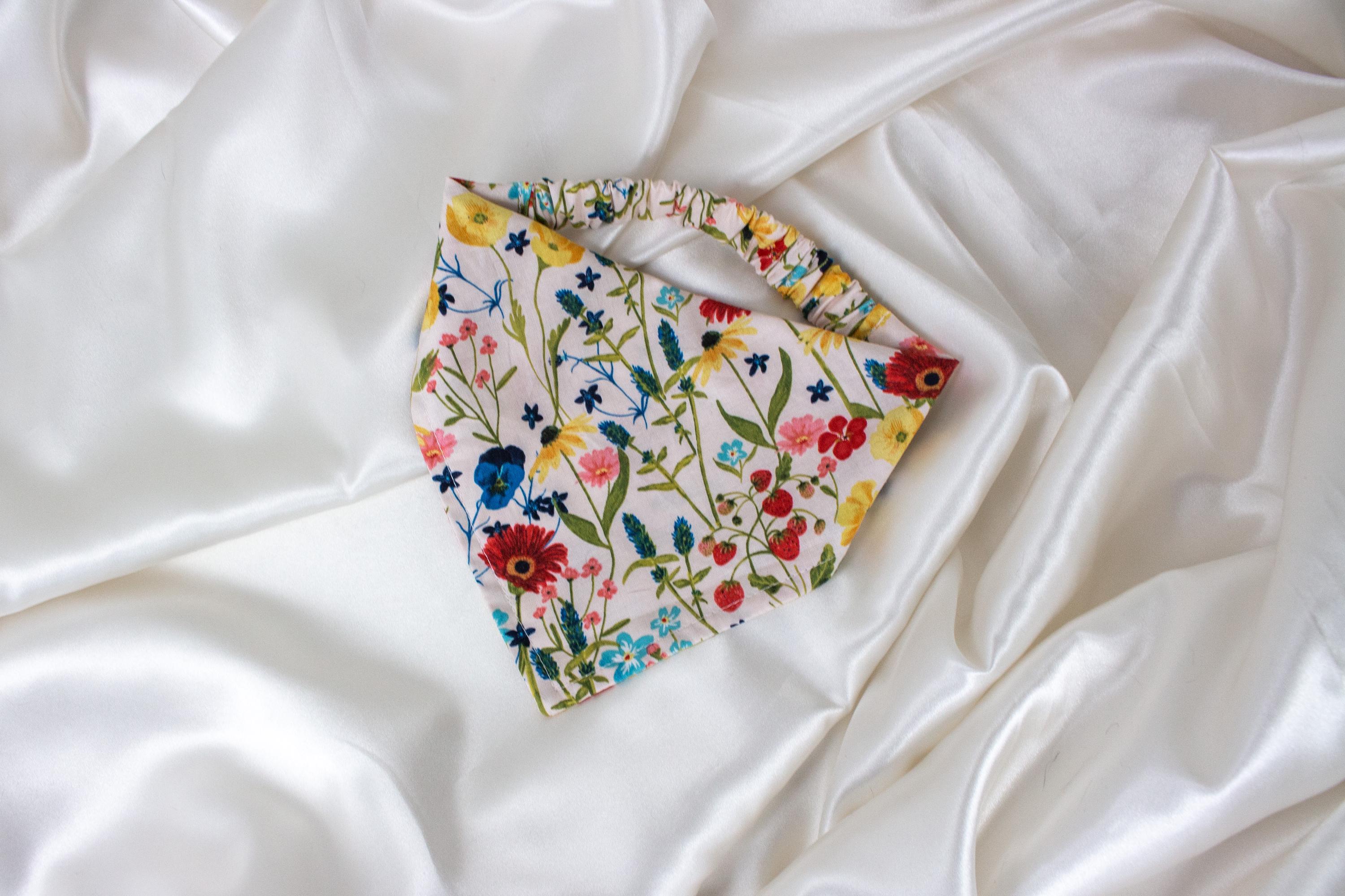 🥰This pet bandana is handmade from quality beige fabric with a beautiful floral pattern of flowers and strawberries! A perfect vibe for spring or summer fun! It features an elastic strap to make it easier to get on and off your pet!