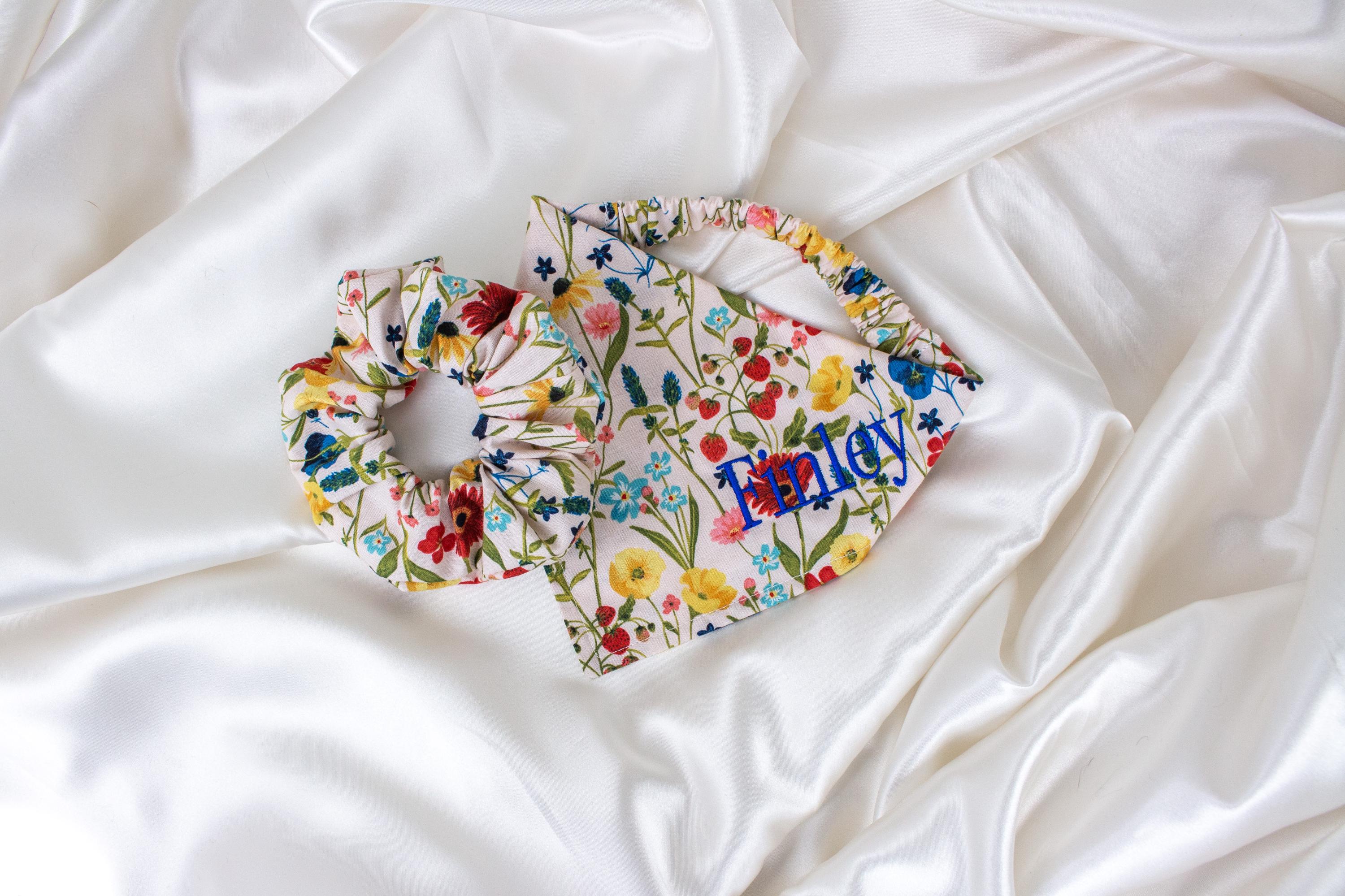 MATCHING Personalized Beige Floral Dog Bandana and Hair Scrunchie Set, Embroidered Strawberry Scrunchy and Dog Scarf with Custom Name