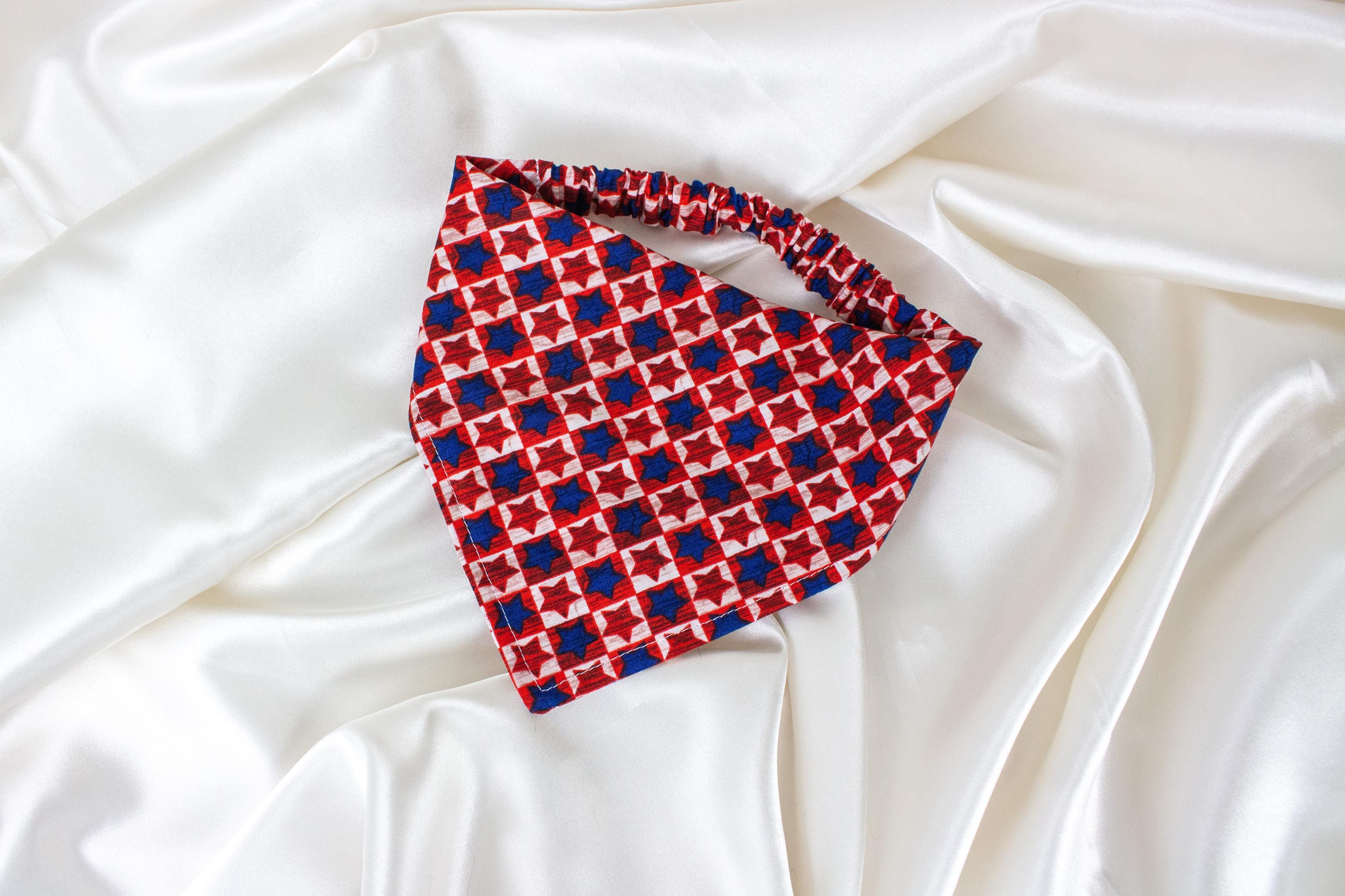🥰This pet bandana is handmade from quality red-white-and-blue fabric with a beautiful, checkered design of rustic stars! It features an elastic strap to make it easier to get on and off your pet!