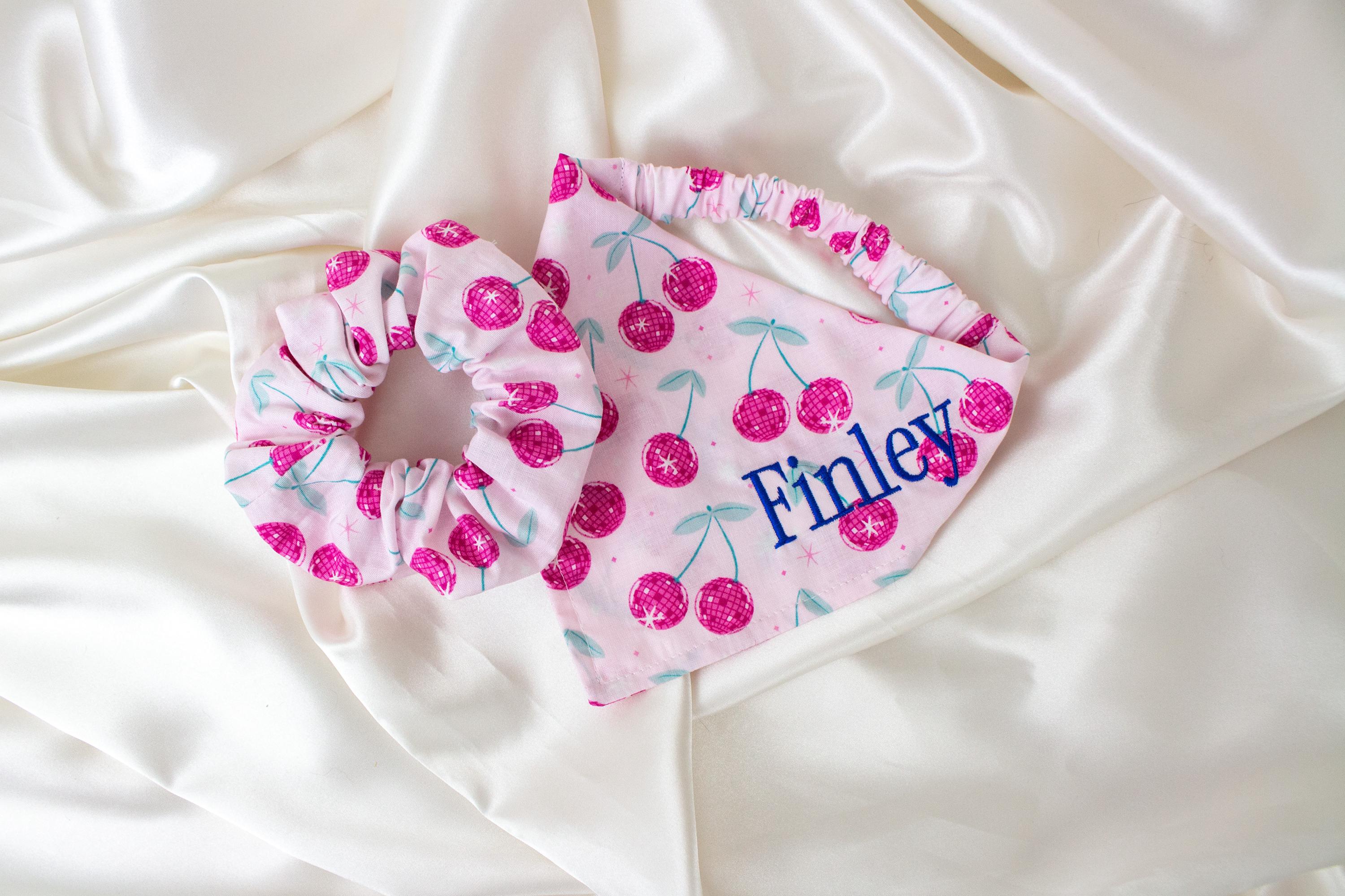 MATCHING Disco Cherries Dog Scarf and Hair Scrunchie Set, Embroidered Scrunchy Pet and Owner Set, Personalized Dog Bandana, Retro, Pink