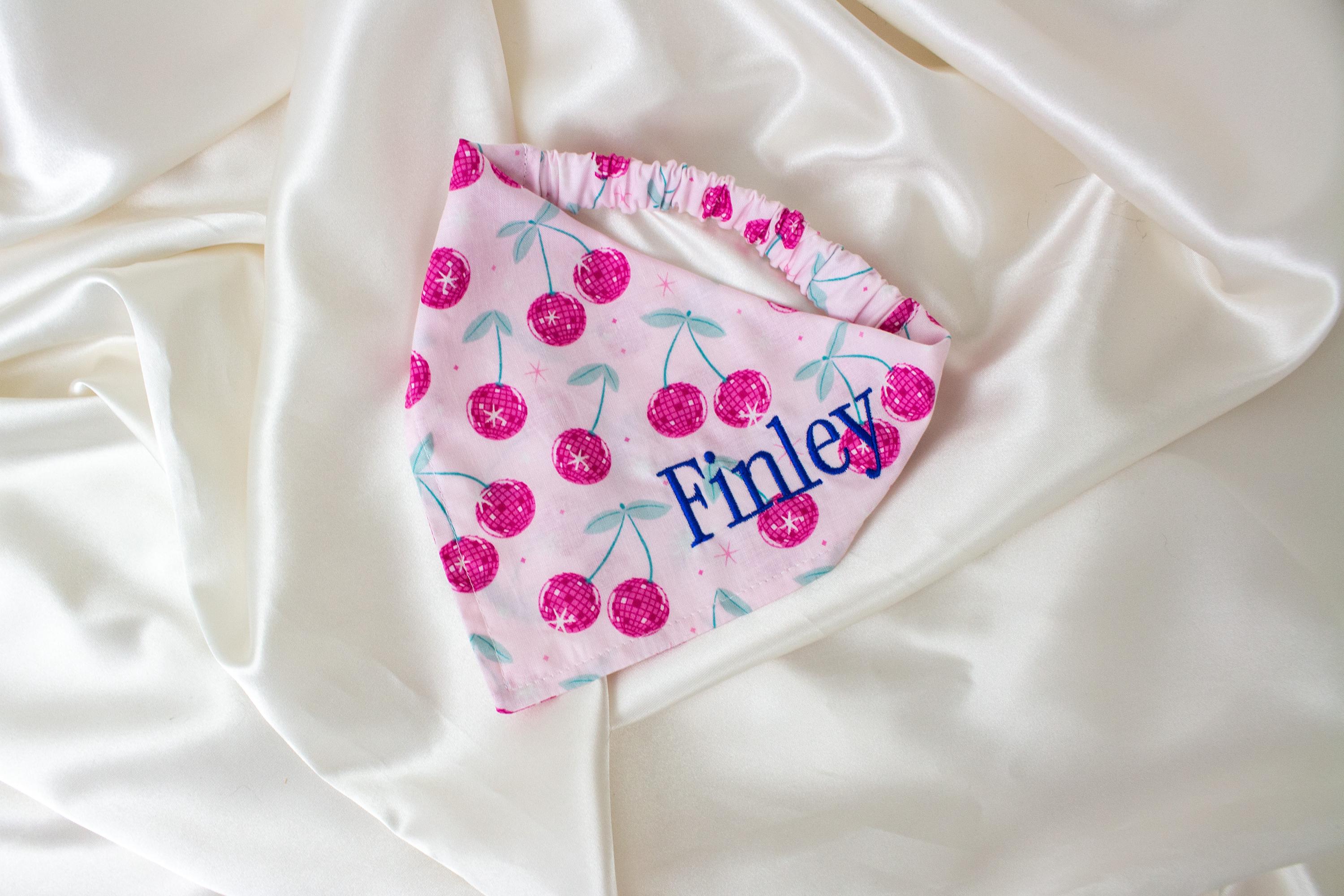 CUSTOM NAME Disco Cherries Dog Bandana, Personalized, Embroidered, Retro, Pink Dog Scarf, Pet Handkerchief with Disco Balls, Dog Gifts