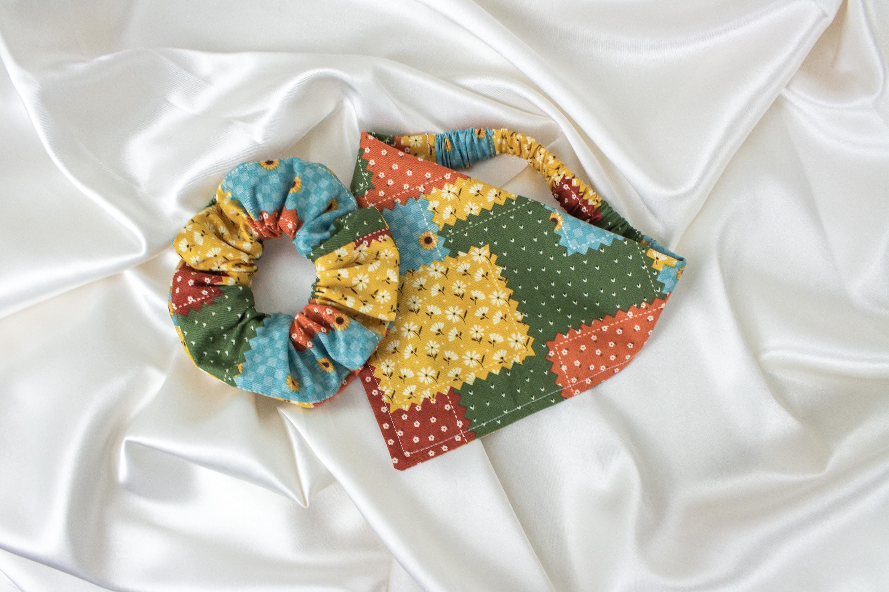 🥰This set lets you match your pet and walk around town looking cute together! This matching pet bandana and hair scrunchie are handmade from quality fabric that is a repeating design that makes it look like a quilt of patchwork fabrics including the colors mustard, burnt orange, olive green, and muted teal; the patterns included are checkered, sunflower floral, and daisy floral!