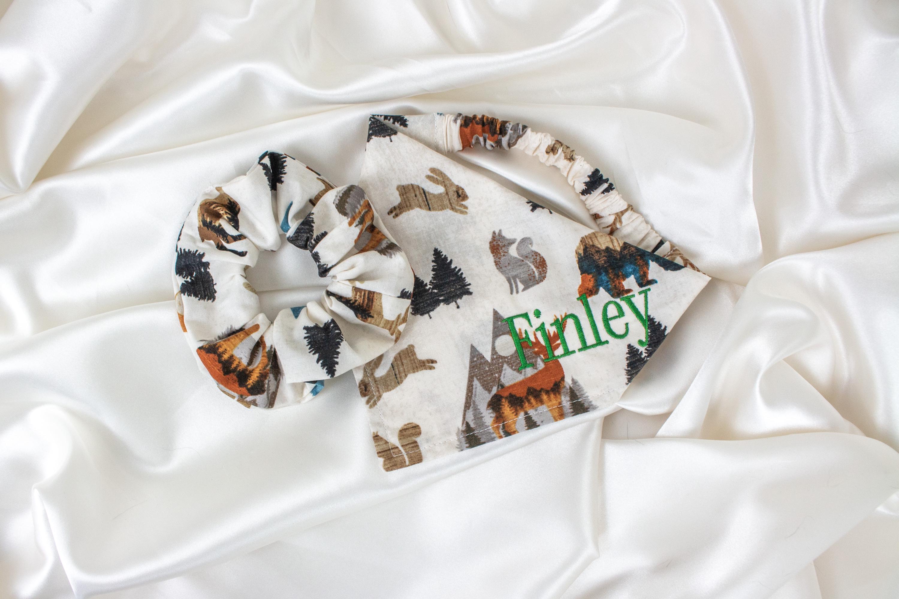 MATCHING Personalized Dog Bandana and Hair Scrunchie Set, Camping Adventure Embroidered Dog Scarf and Scrunchy, Custom Name, Outdoors