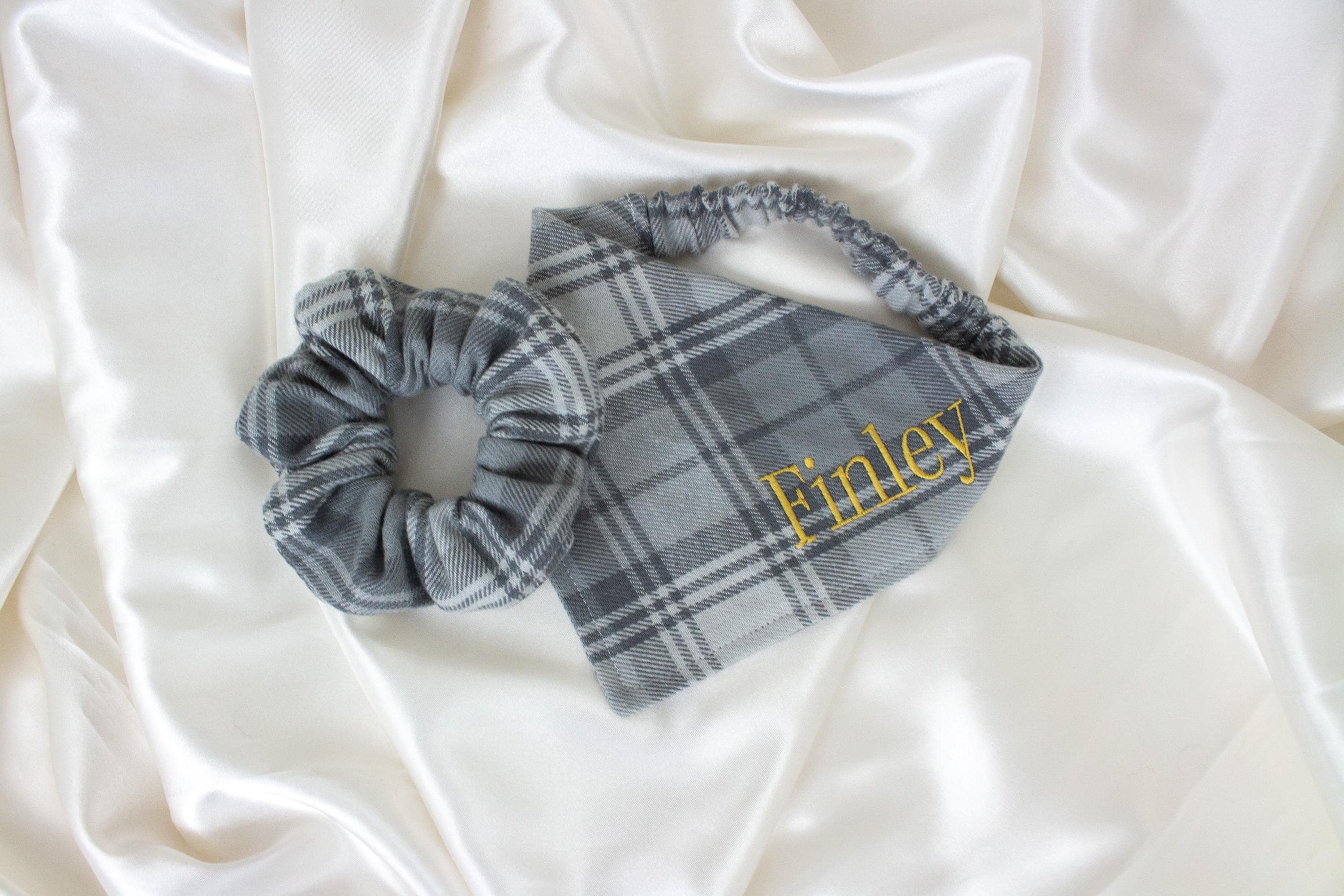 MATCHING Personalized Grey Flannel Dog Bandana and Hair Scrunchie Set, Embroidered, Plaid Dog Scarf and Scrunchy, Fall Dog Bandana, Autumn