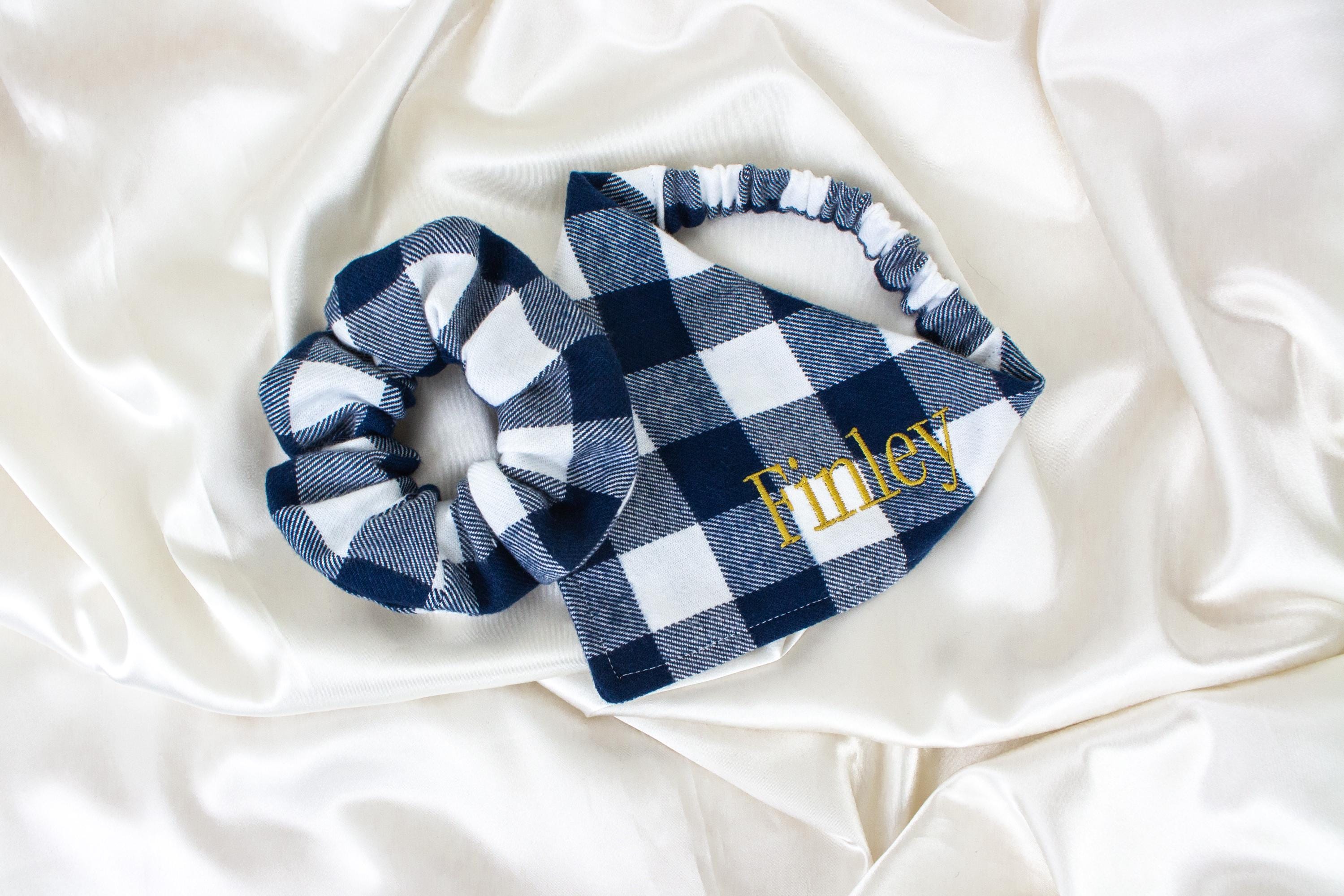 MATCHING Embroidered Flannel Dog Bandana and Hair Scrunchy Set, Personalized Buffalo Plaid Pet Handkerchief, Fall Dog Scarf and Scrunchie