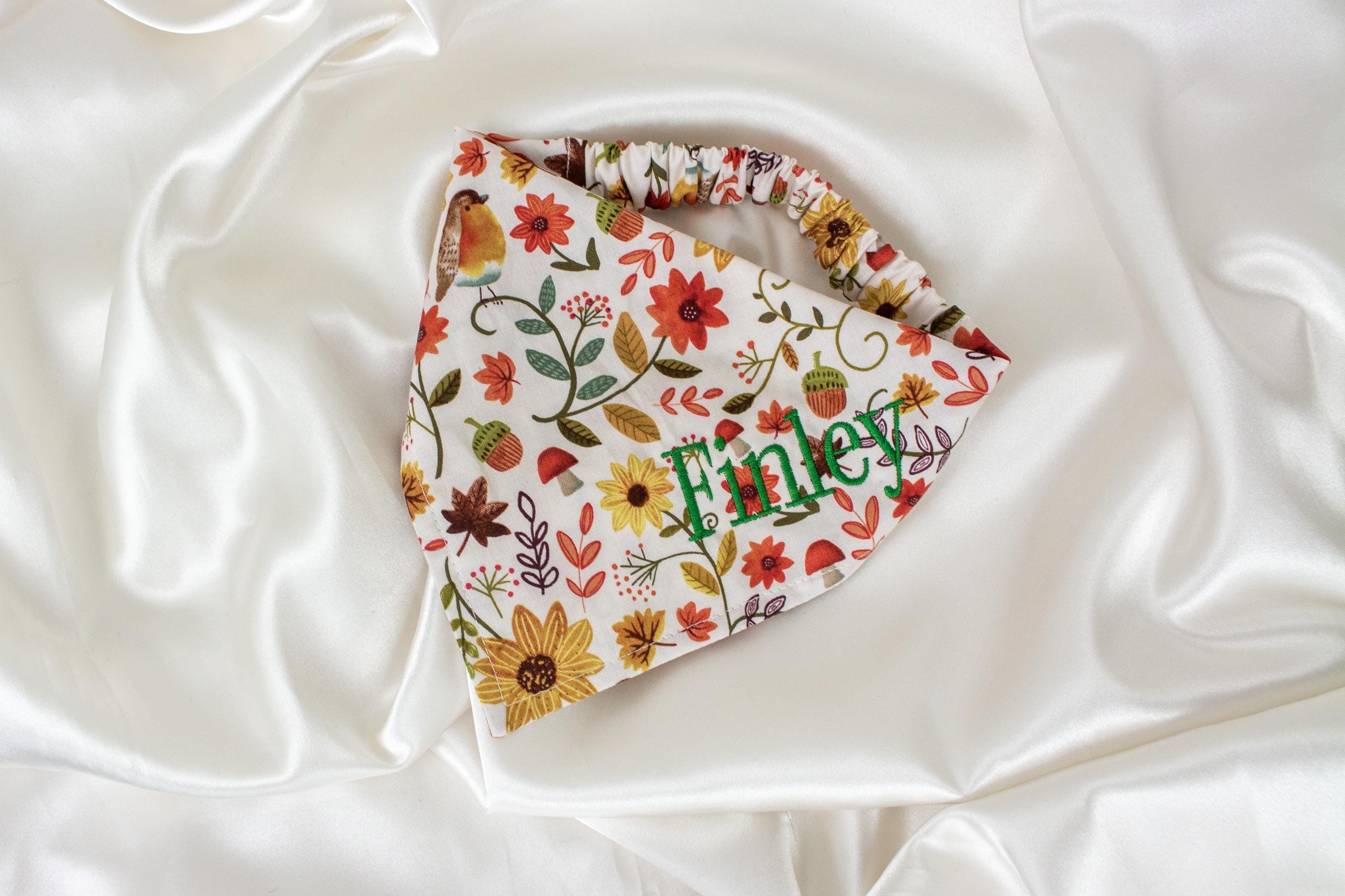 Personalized Floral Fall Dog Bandana, Embroidered Autumn Dog Scarf with Mushrooms, Custom Name, Pet Handkerchief, Flowers