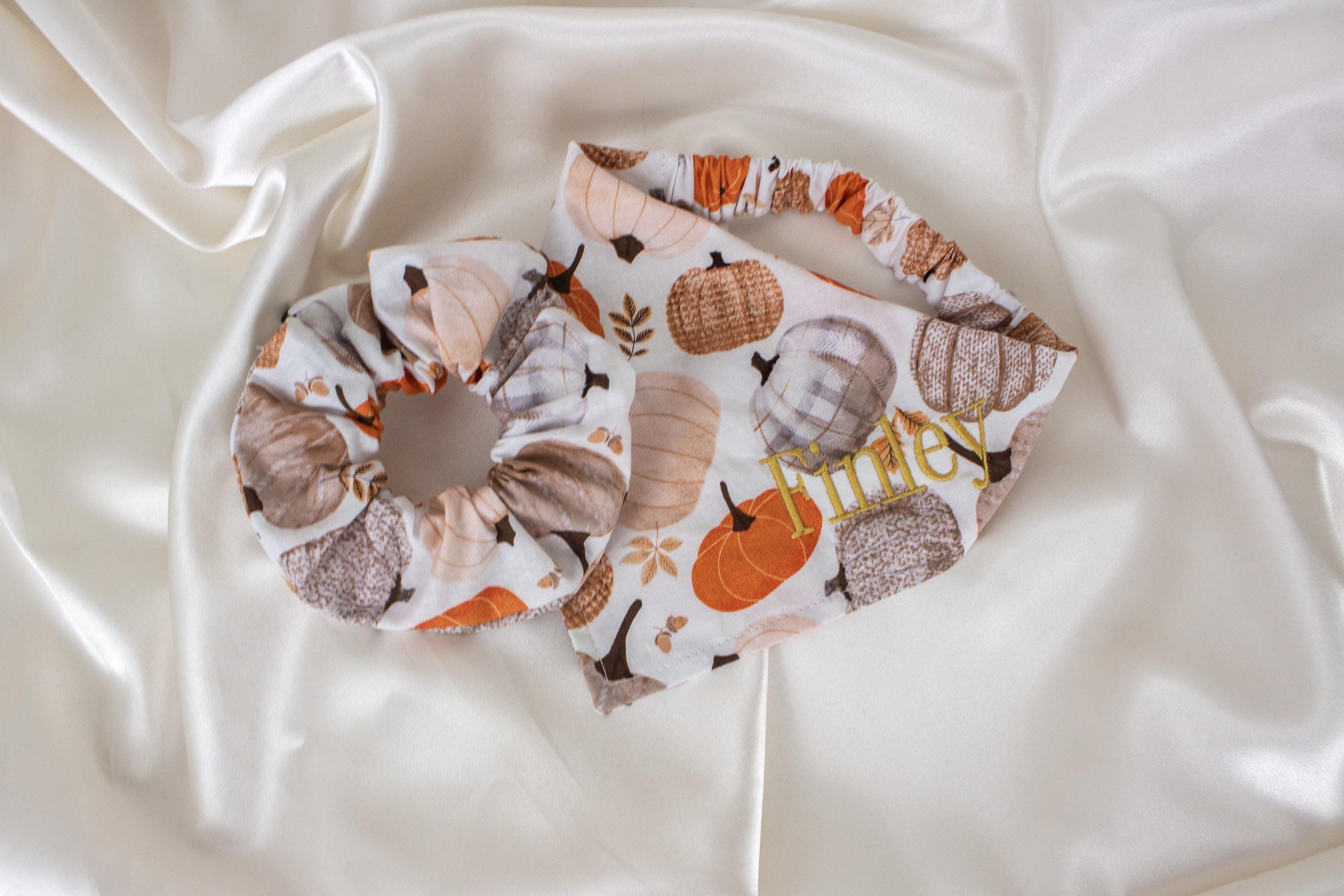 Embroidered Fall Dog Bandana and Hair Scrunchie Set, Personalized, Beige Dog Scarf and Scrunchy with Plaid Pumpkins, Pet and Owner