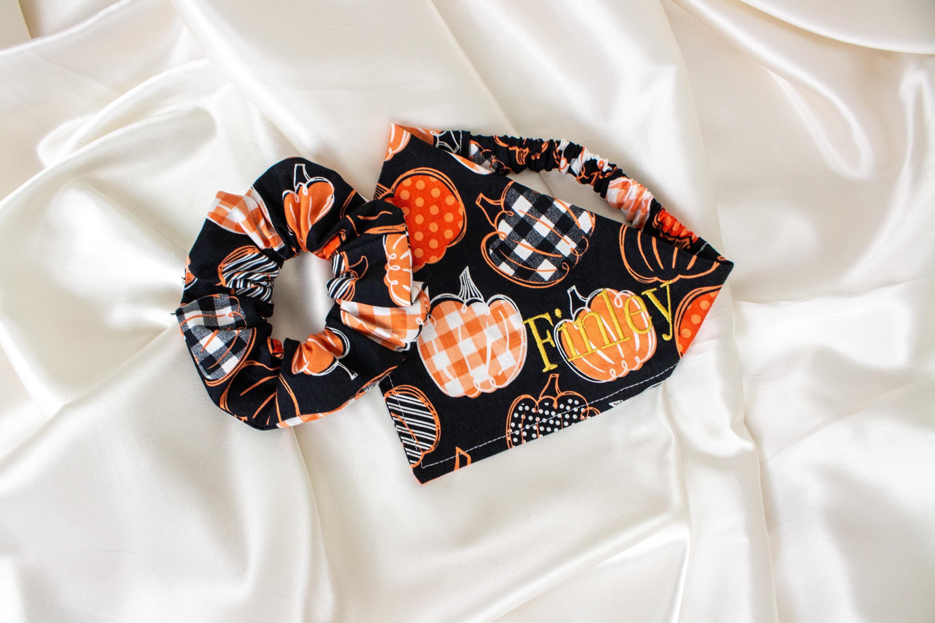 MATCHING Personalized Fall Dog Bandana and Hair Scrunchie Set with Plaid Gingham Pumpkins, Embroidered, Autumn Pet Handkerchief, Dog Scarf and Scrunchy Matching Pet and Owner Pack