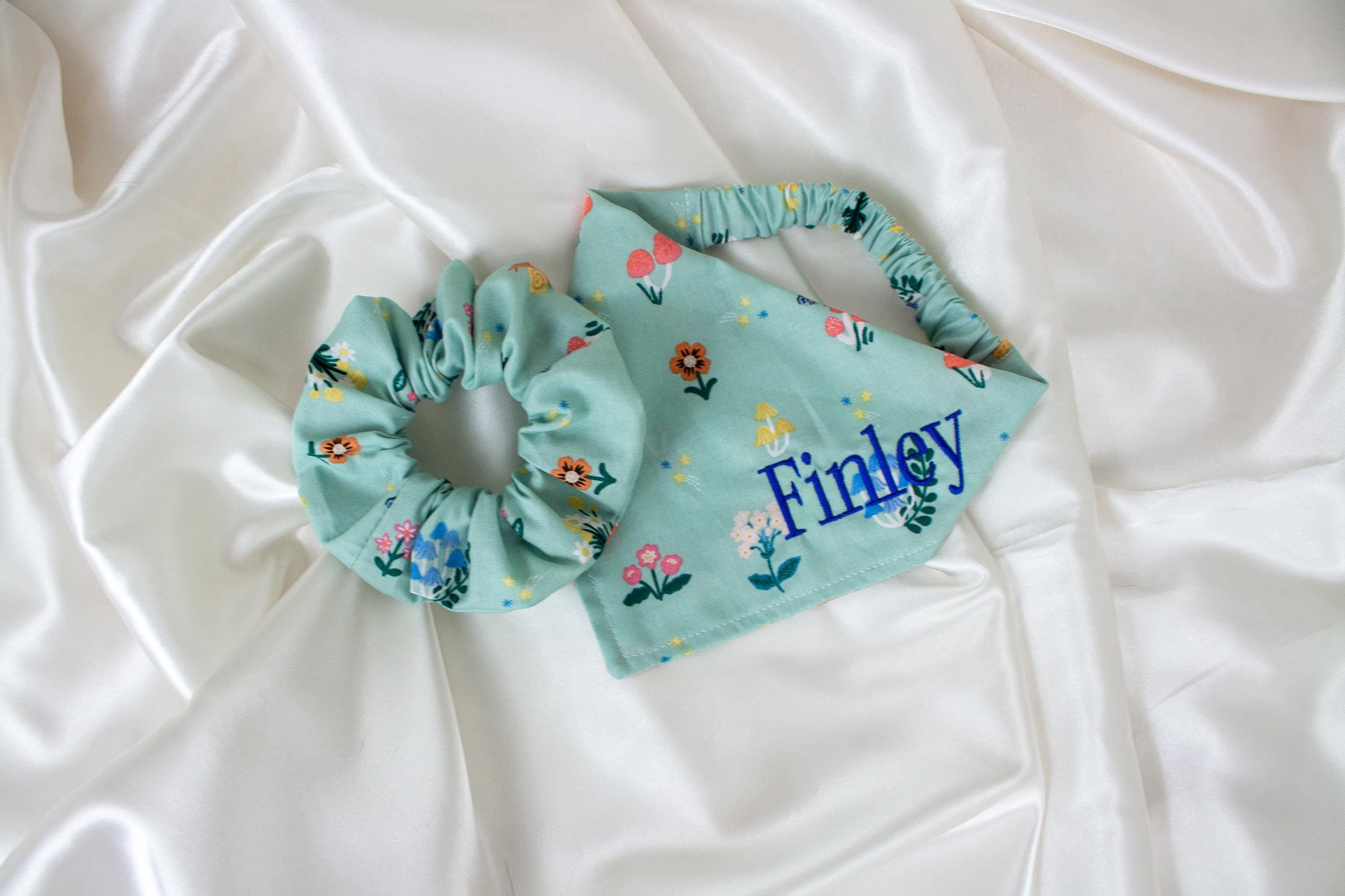 MATCHING Sage Green Floral Personalized Dog Bandana and Hair Scrunchie Set, Embroidered, Custom Name Dog Scarf, Pet and Owner Pack for Spring