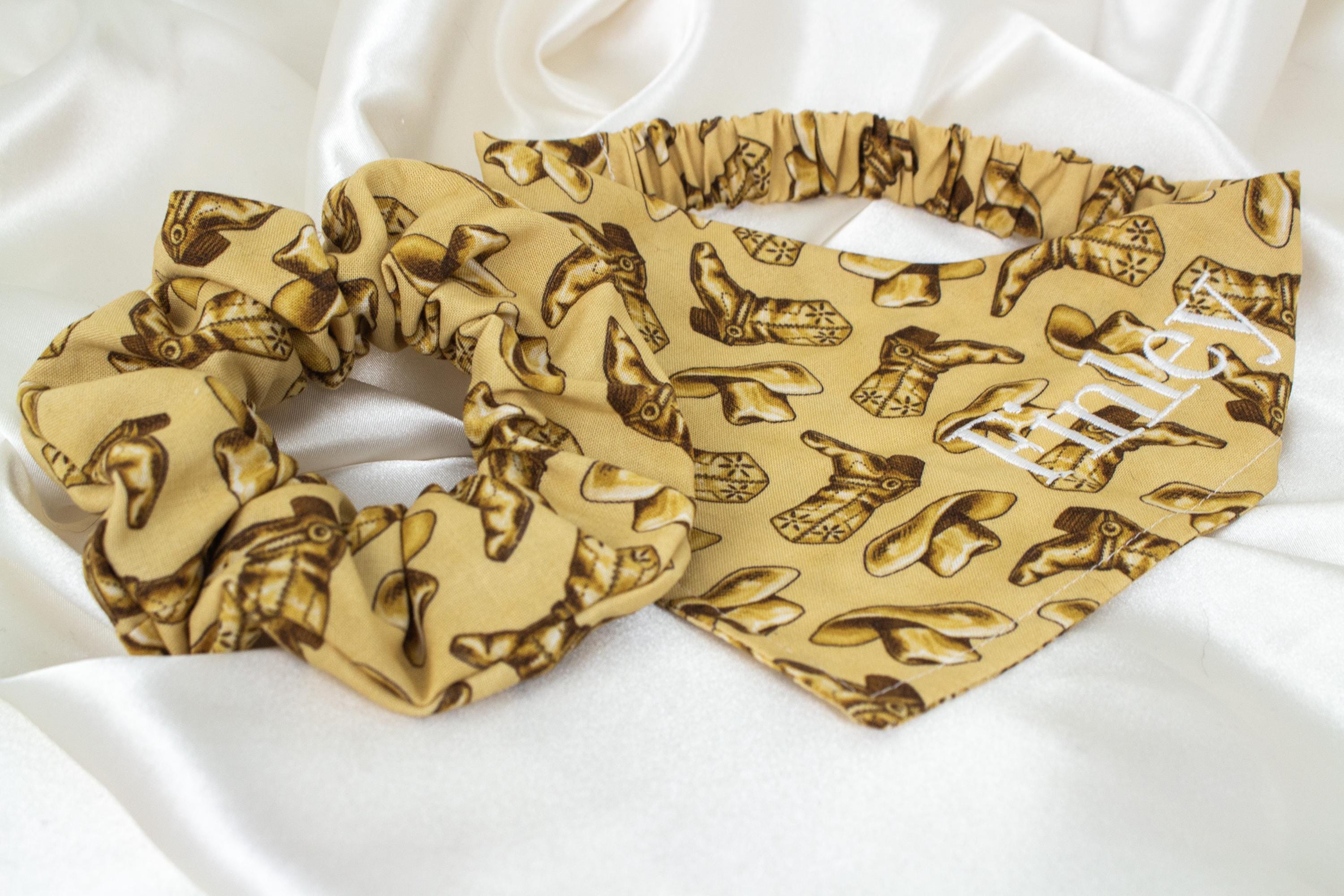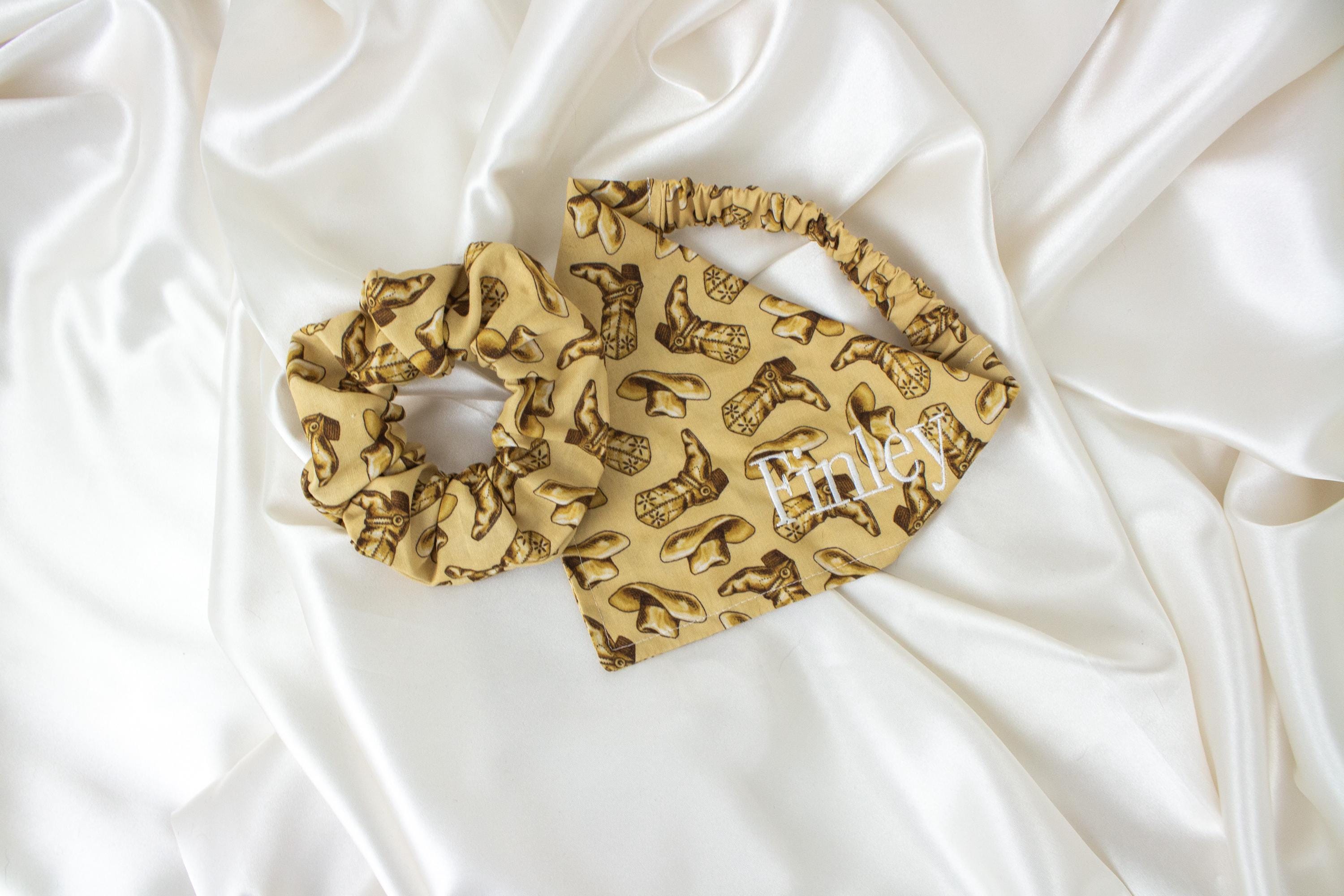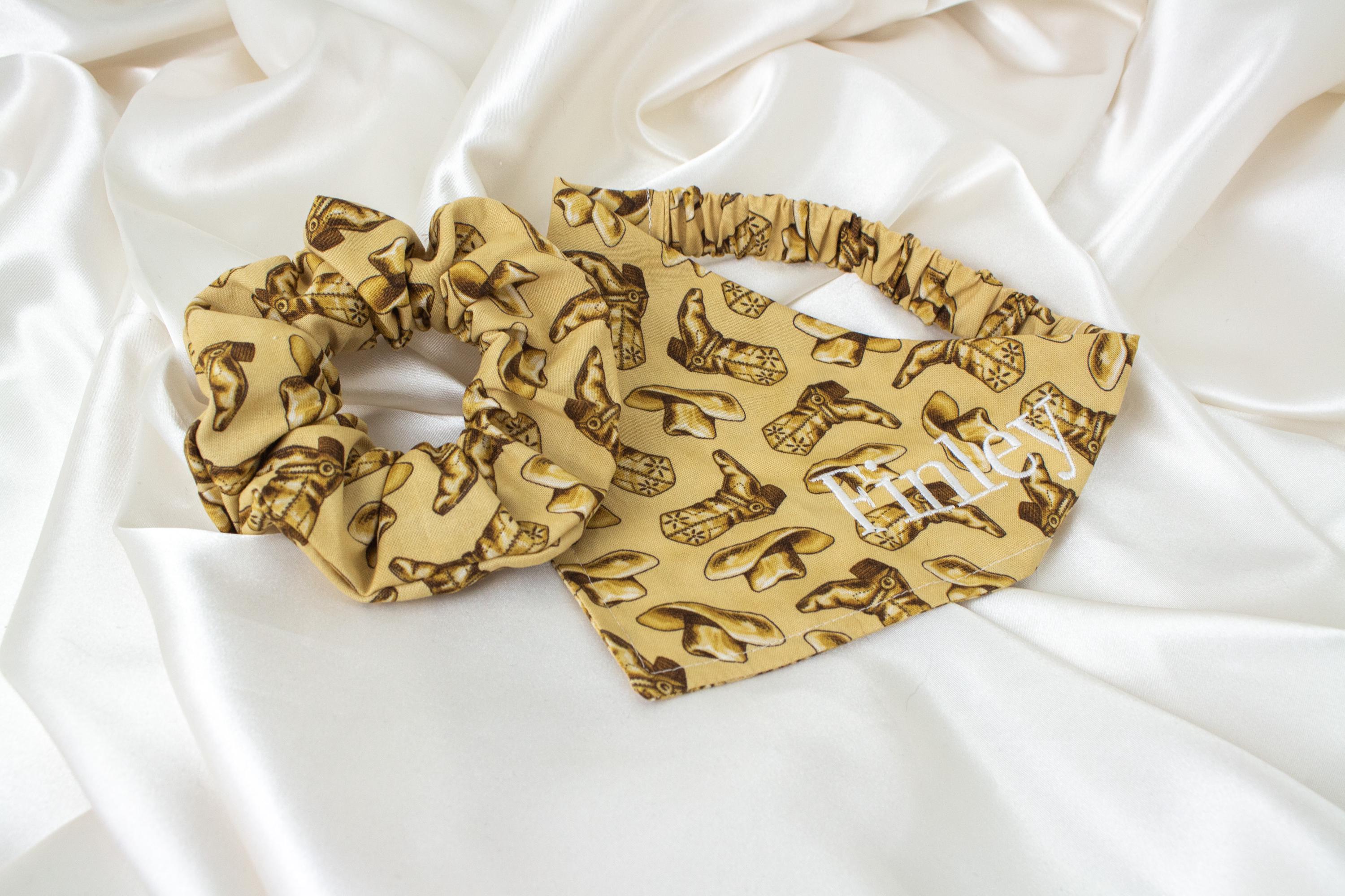 🥰This set lets you match your pet and walk around town looking cute together! This matching pet bandana and hair scrunchie are handmade from quality beige fabric with a beautiful pattern including cowboy boots and cowboy hats!