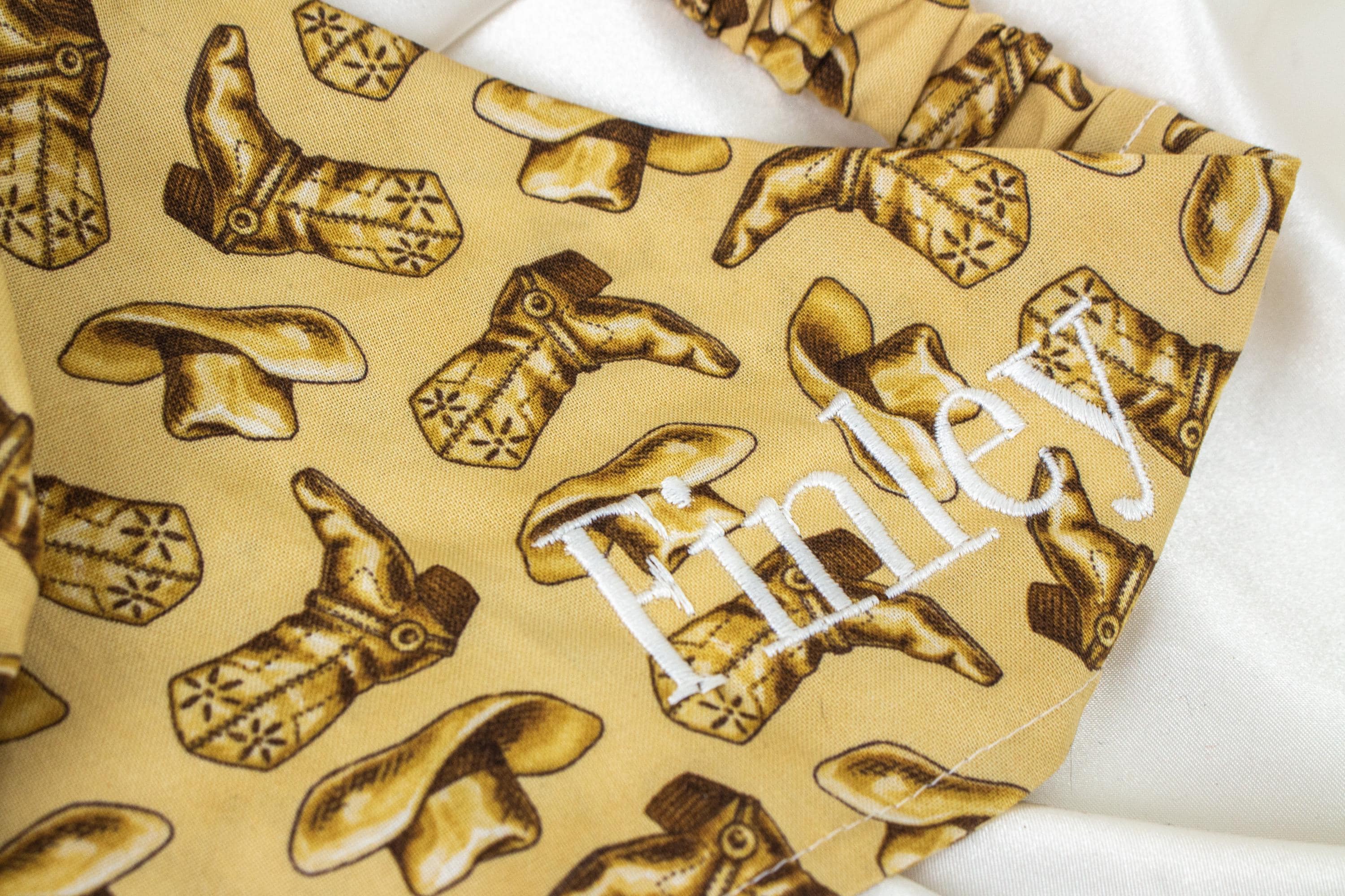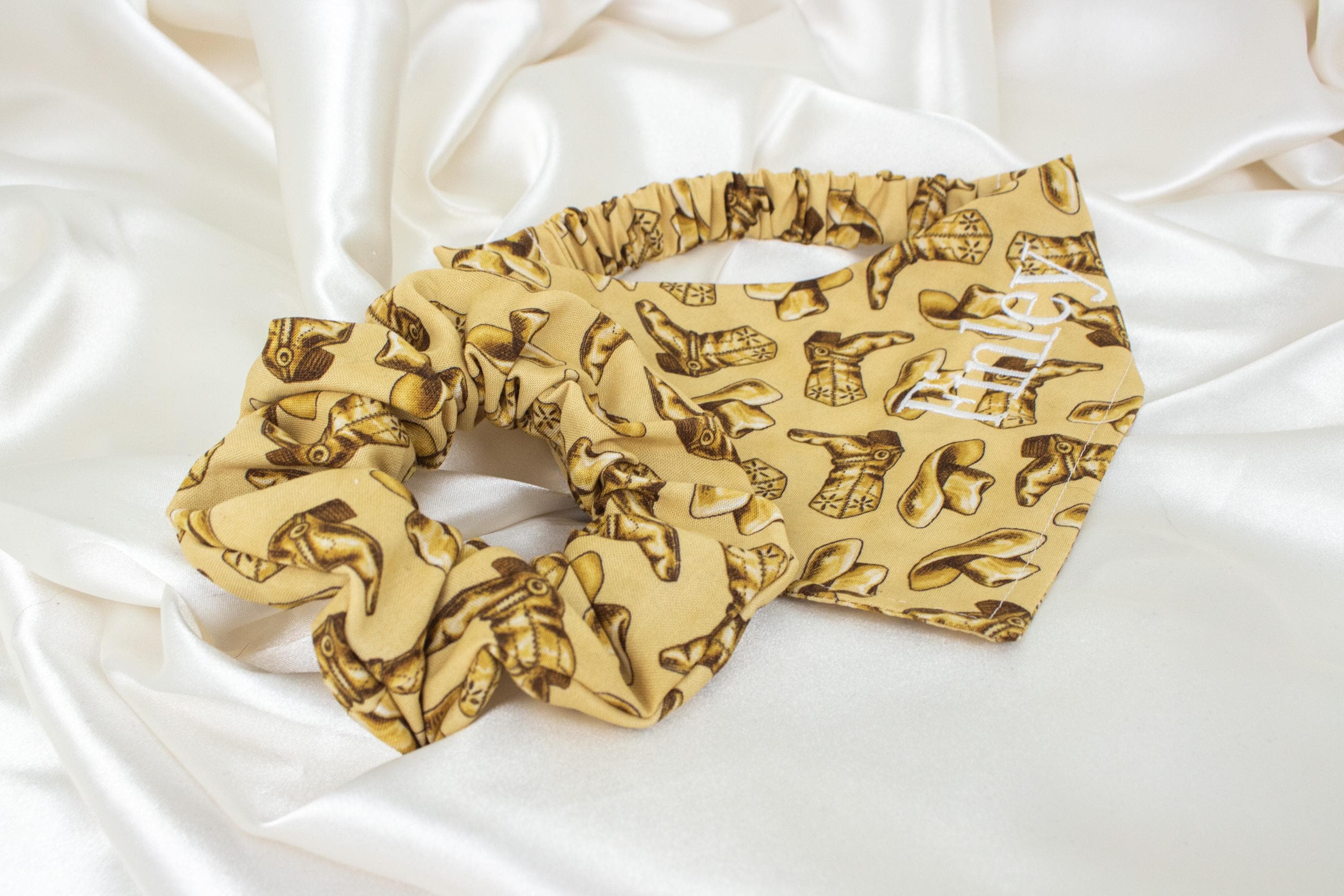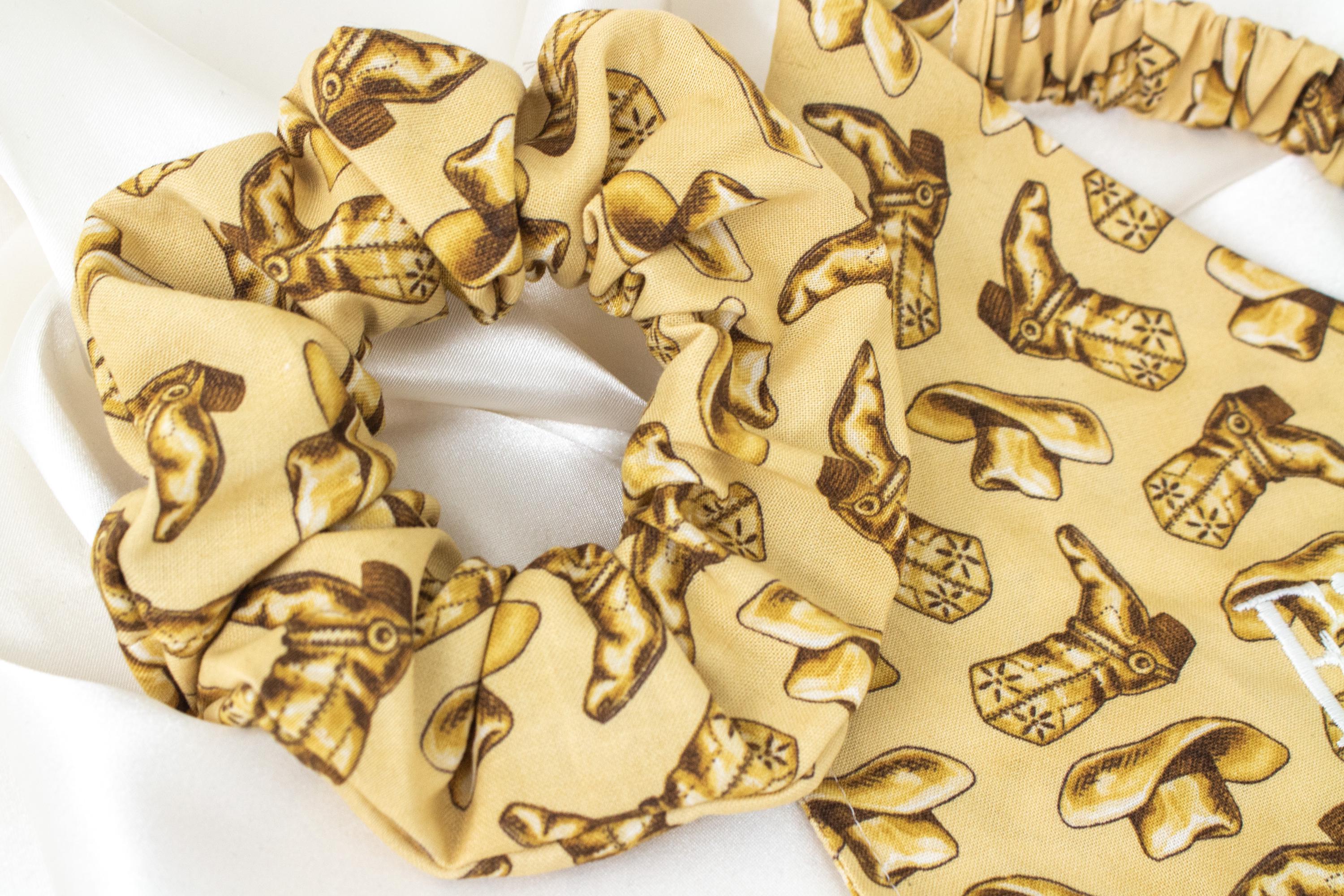 🥰This set lets you match your pet and walk around town looking cute together! This matching pet bandana and hair scrunchie are handmade from quality beige fabric with a beautiful pattern including cowboy boots and cowboy hats!