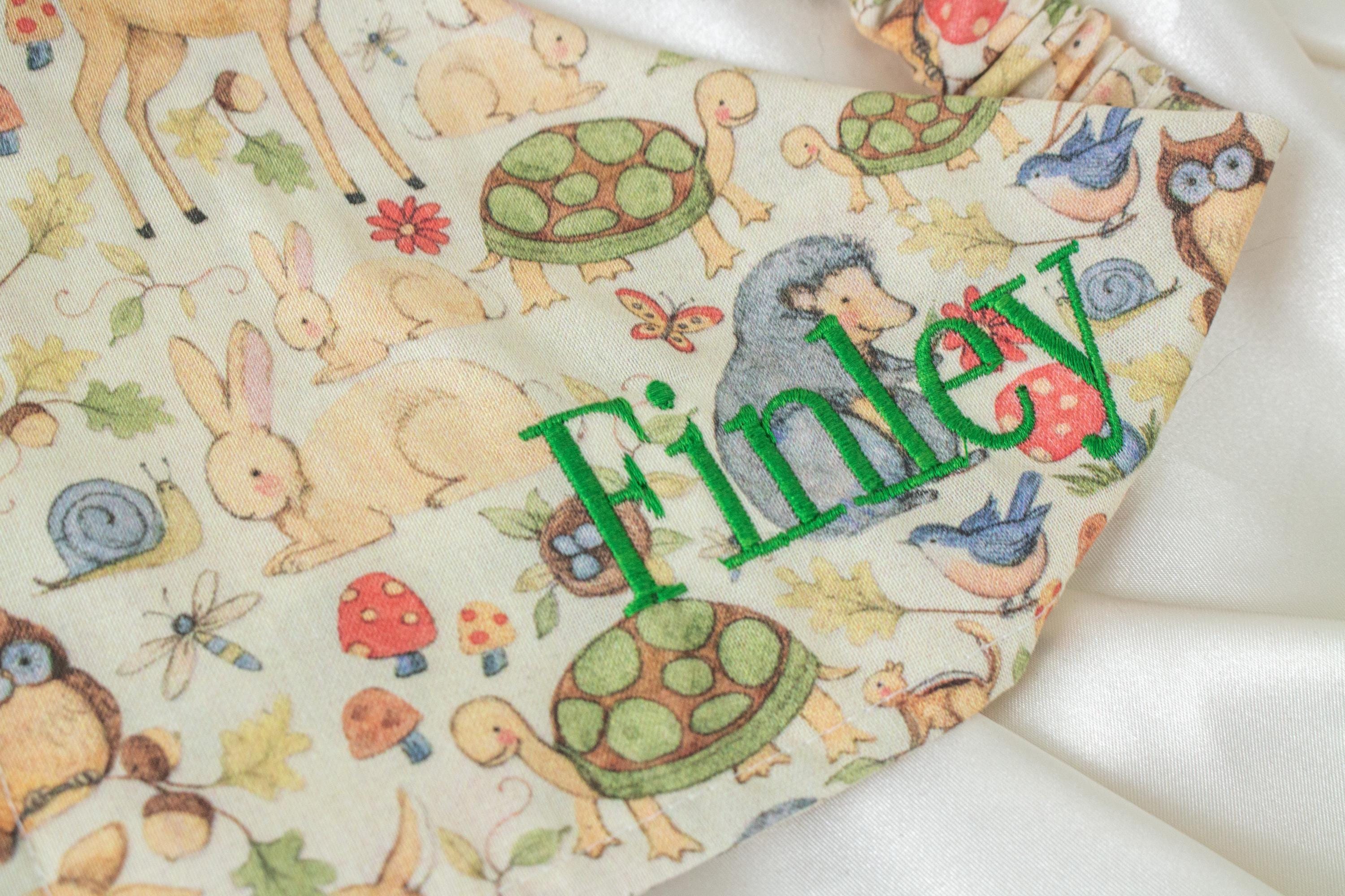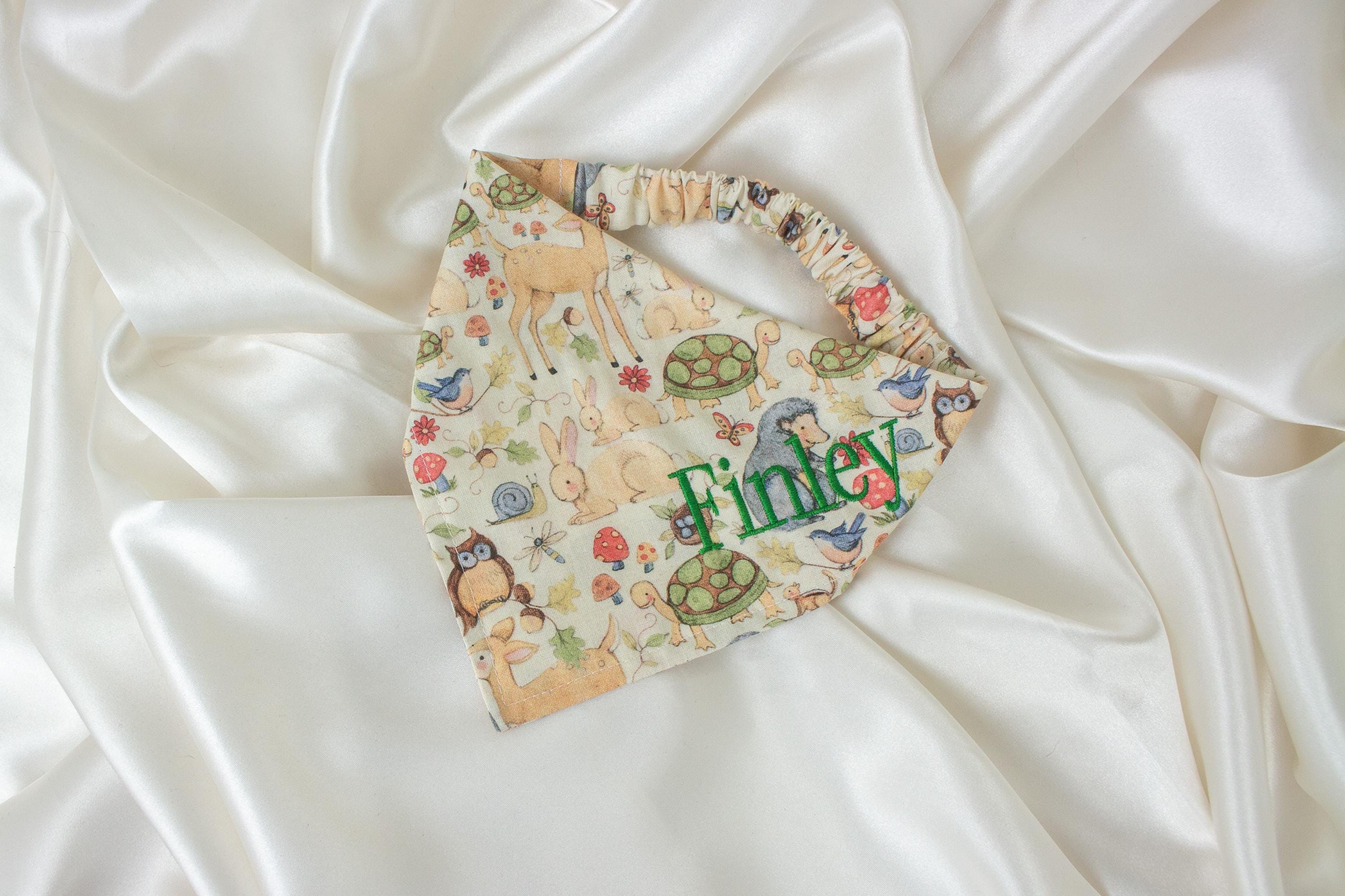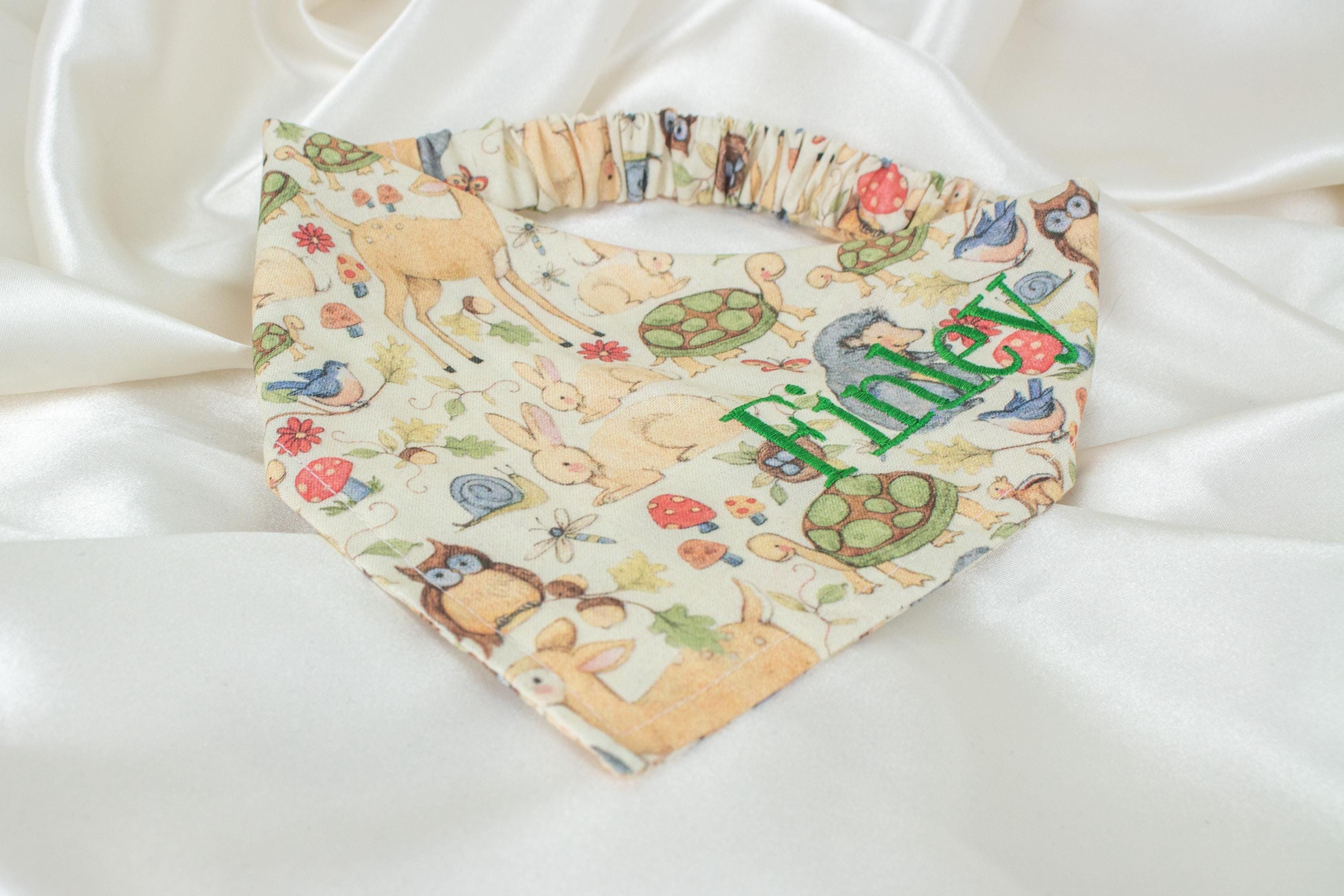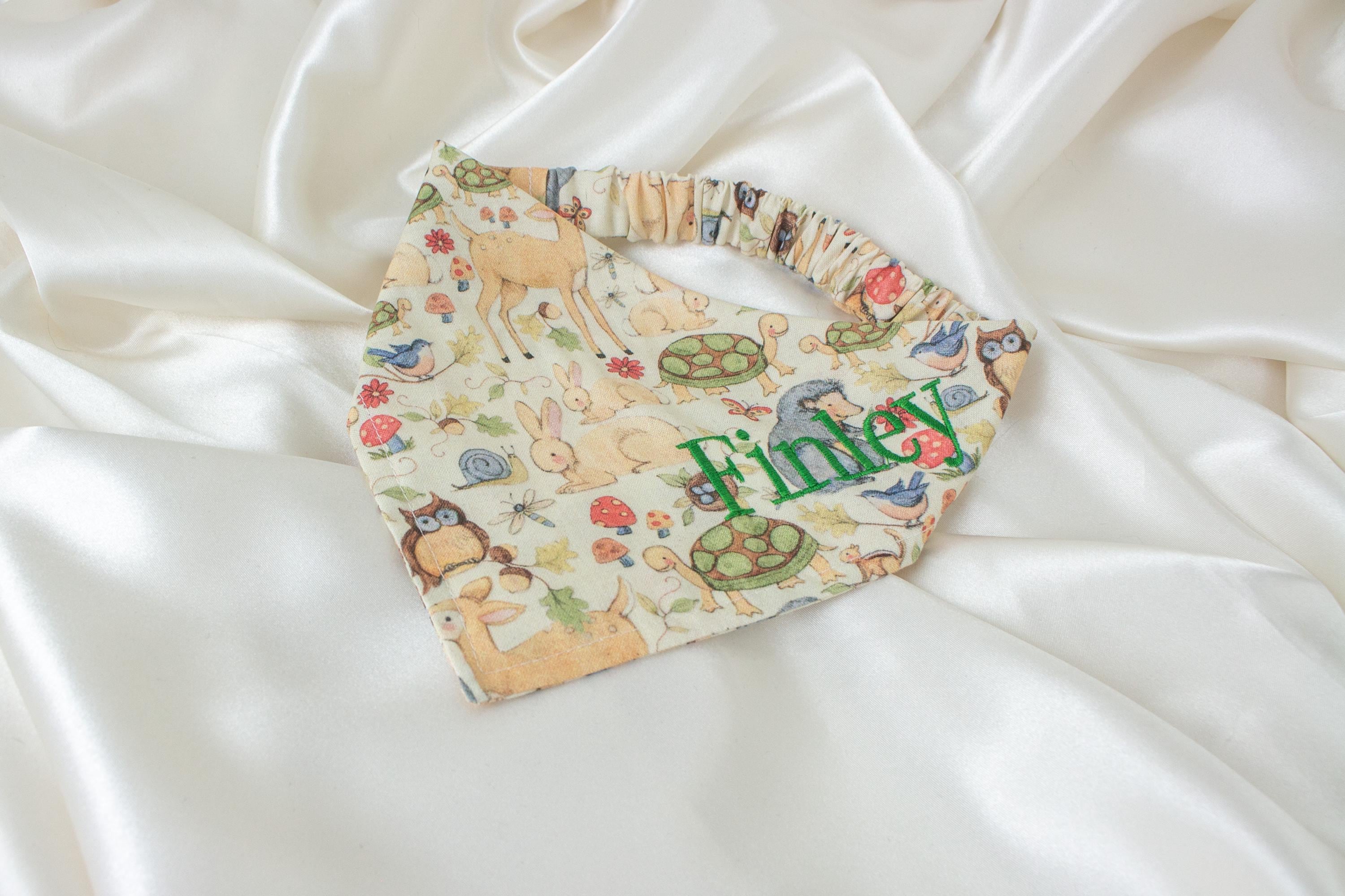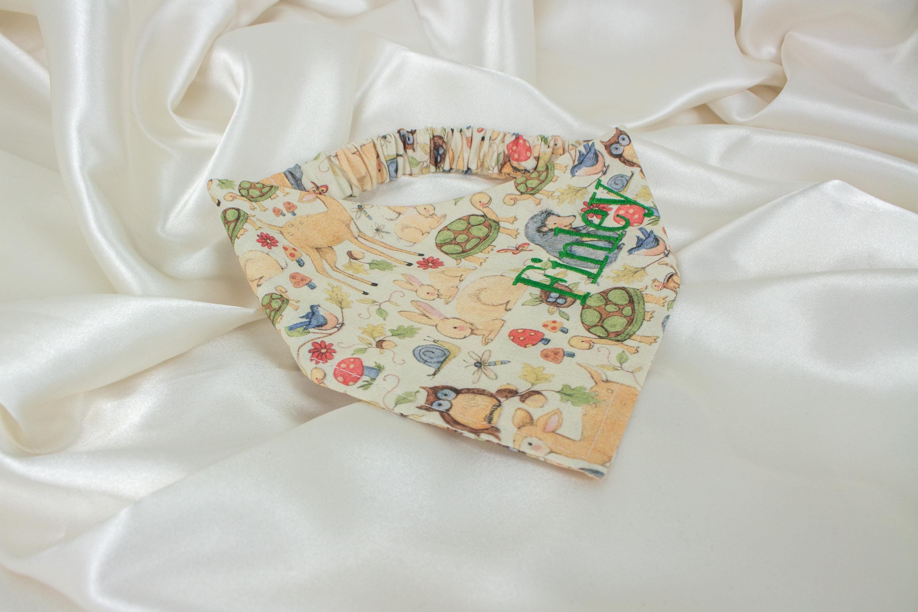 🥰This set lets you match your pet and walk around town looking cute together! This matching pet bandana and hair scrunchie are handmade from quality cream-colored fabric with a pattern of sweet, cute, adorable woodland animals: deer, owls, bunny rabbits, snails, turtles, and pretty butterflies! And mushrooms, too! This pattern is very gentle, subtle, and calming!