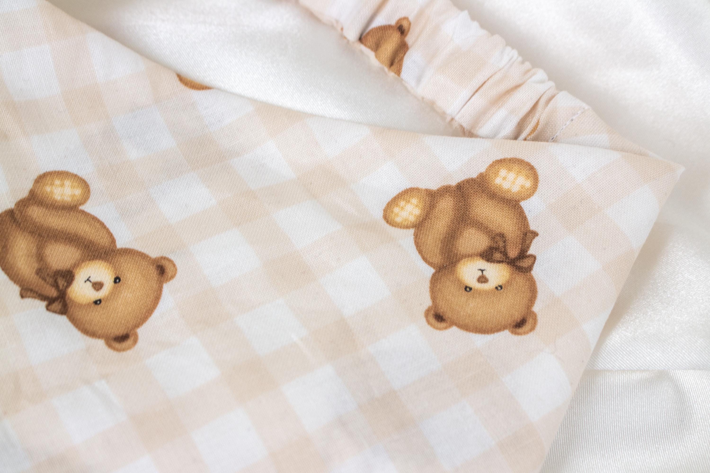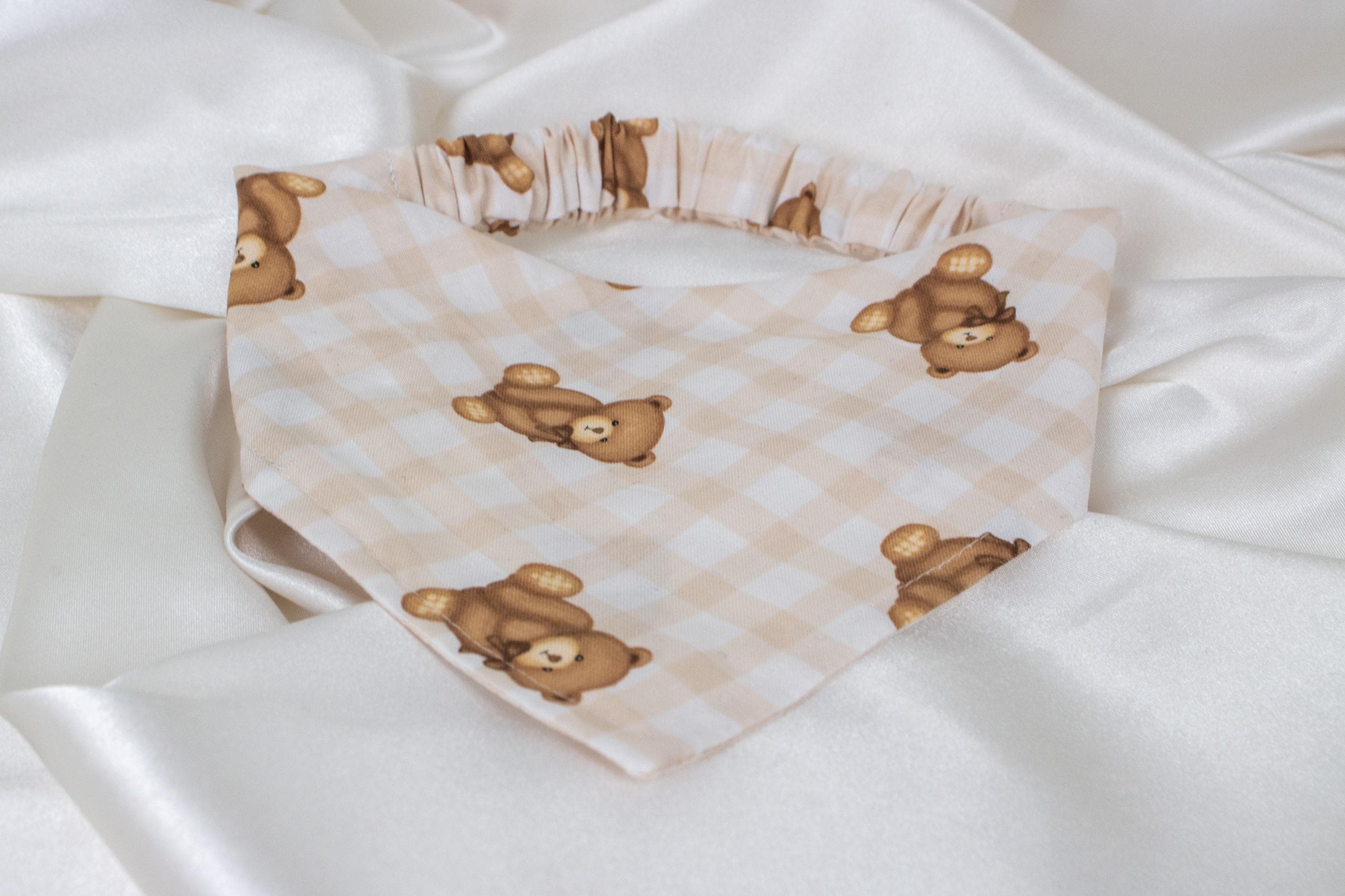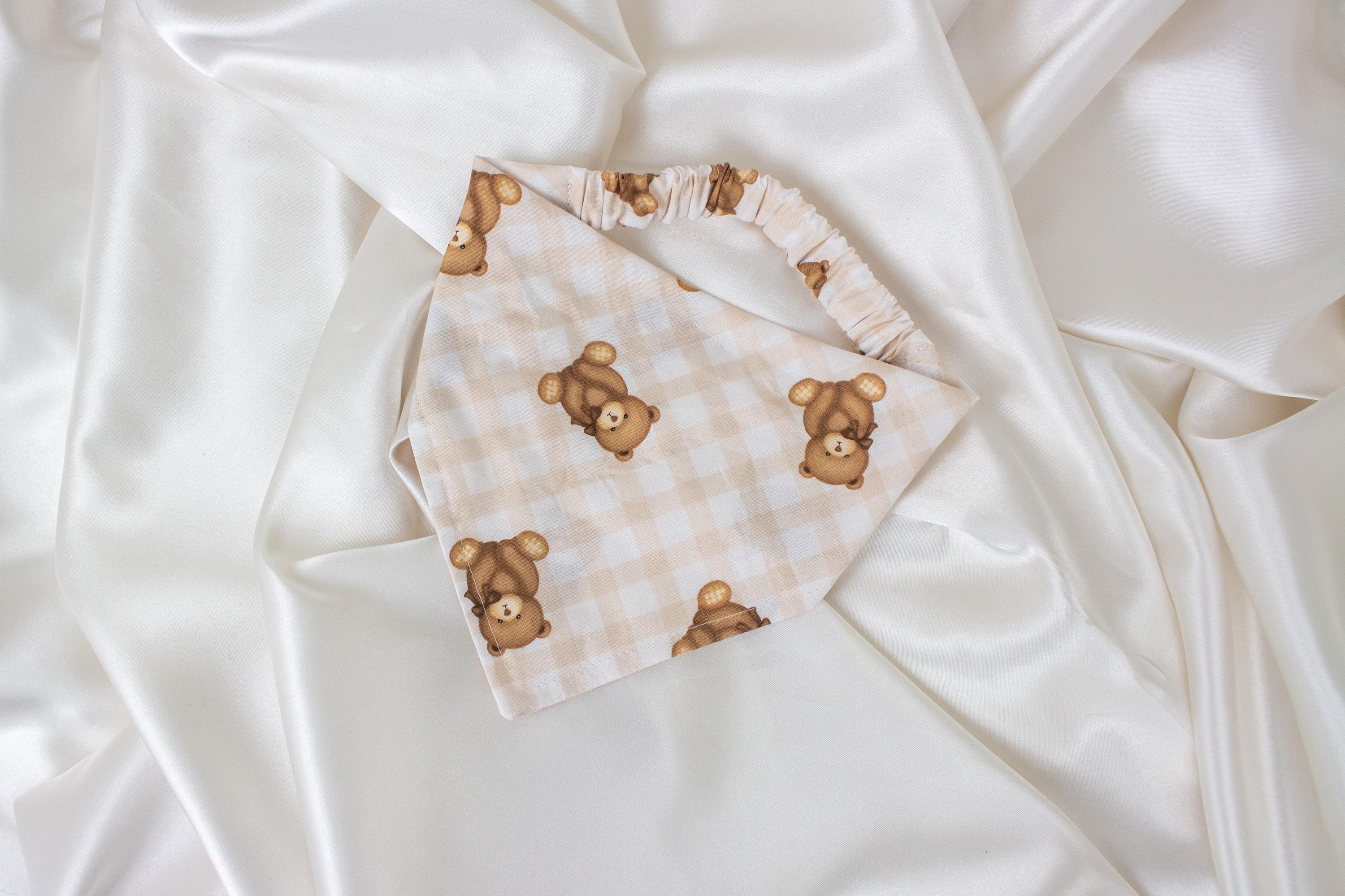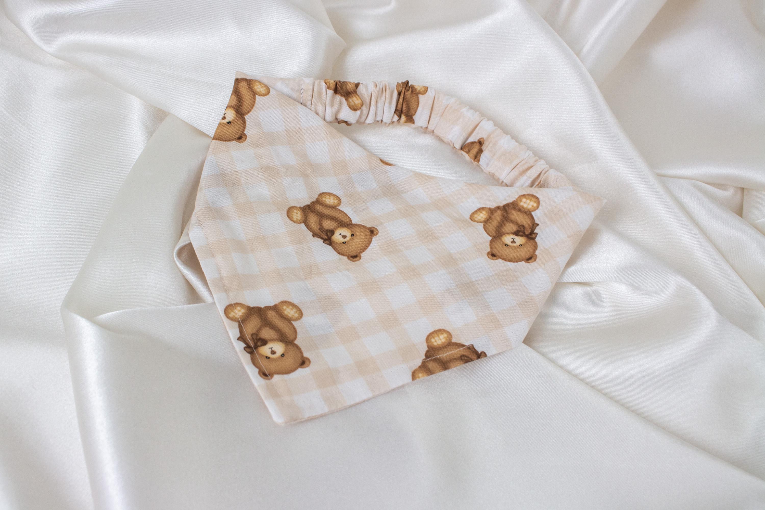 🥰This pet bandana is handmade from handmade from quality beige, gingham plaid fabric with an adorable teddy bear design! It features an elastic strap to make it easier to get on and off your pet!