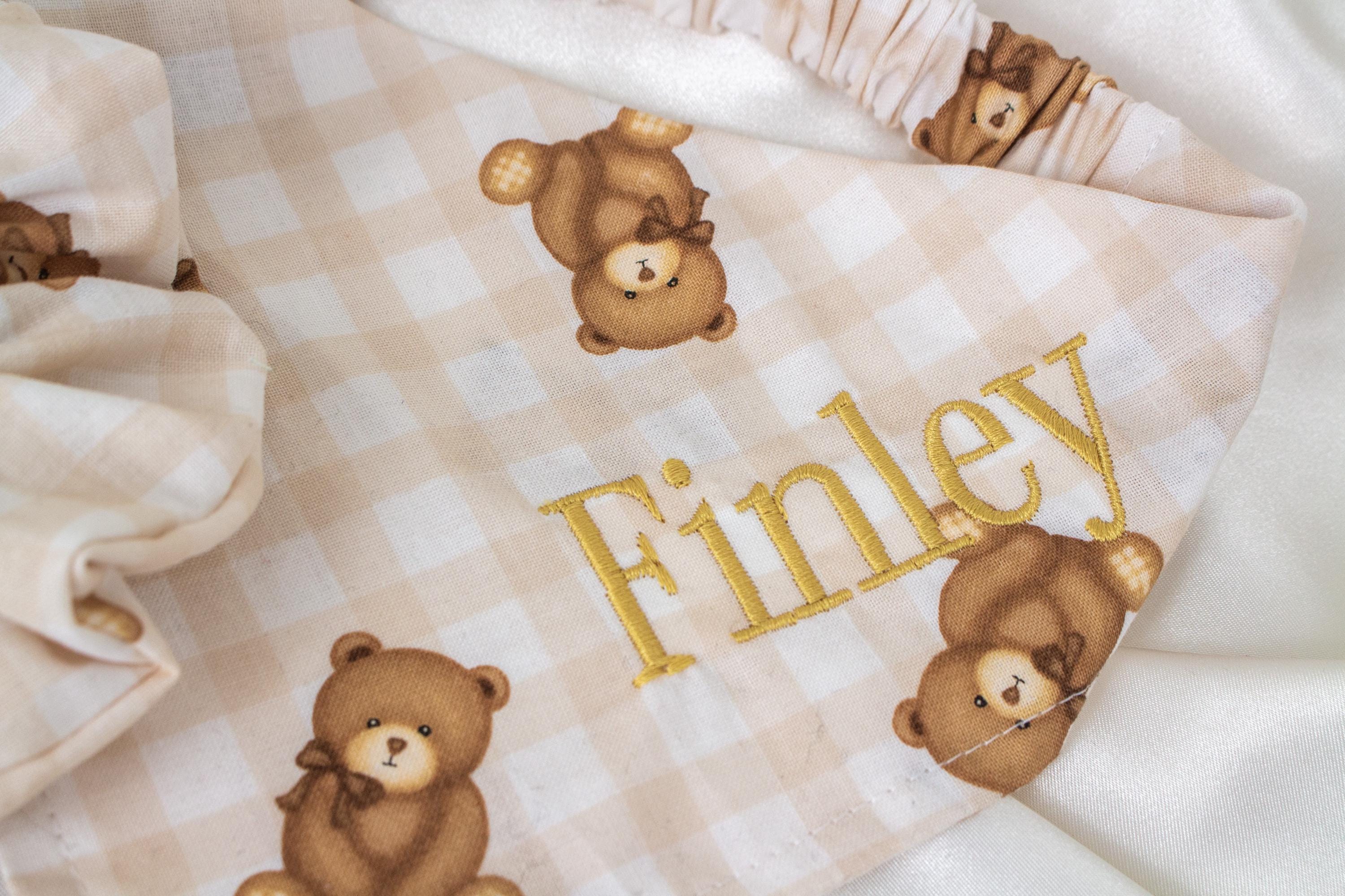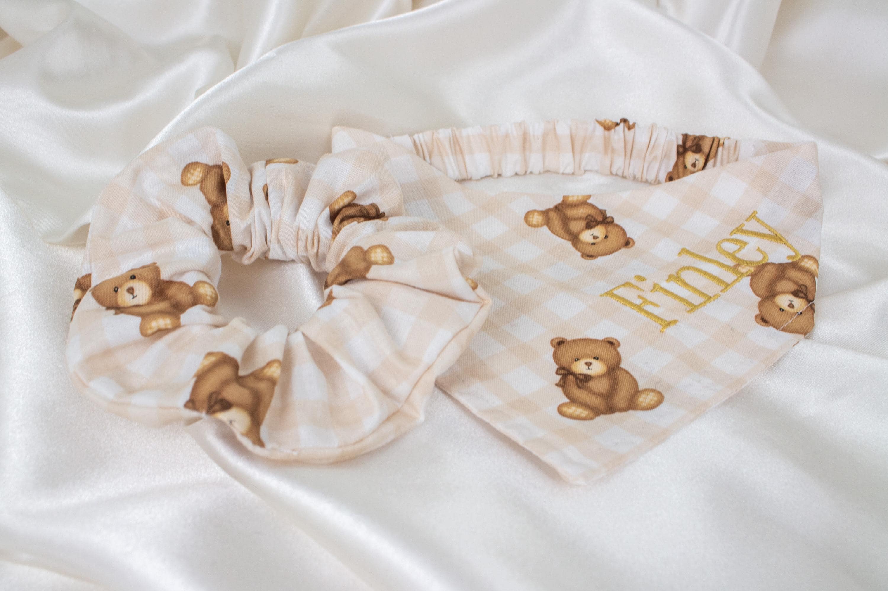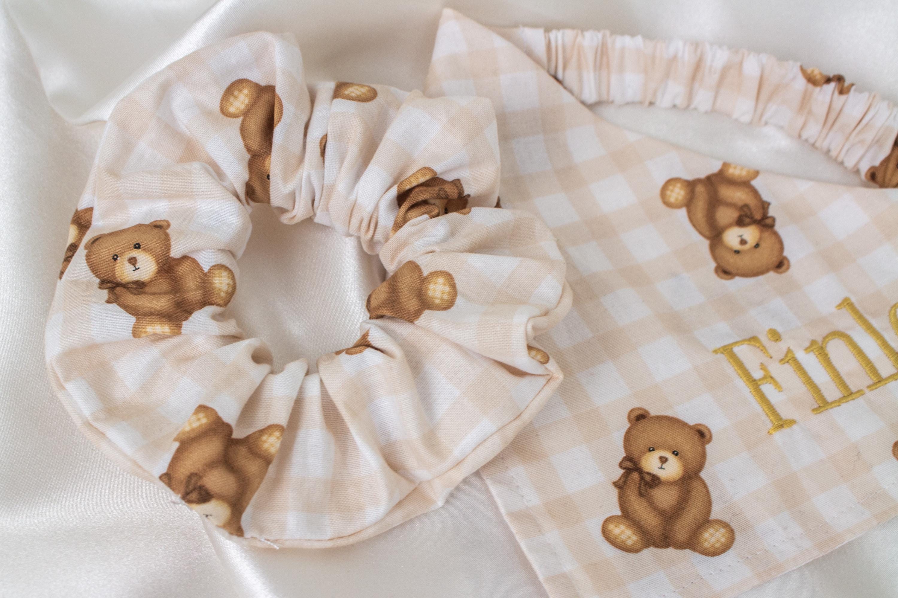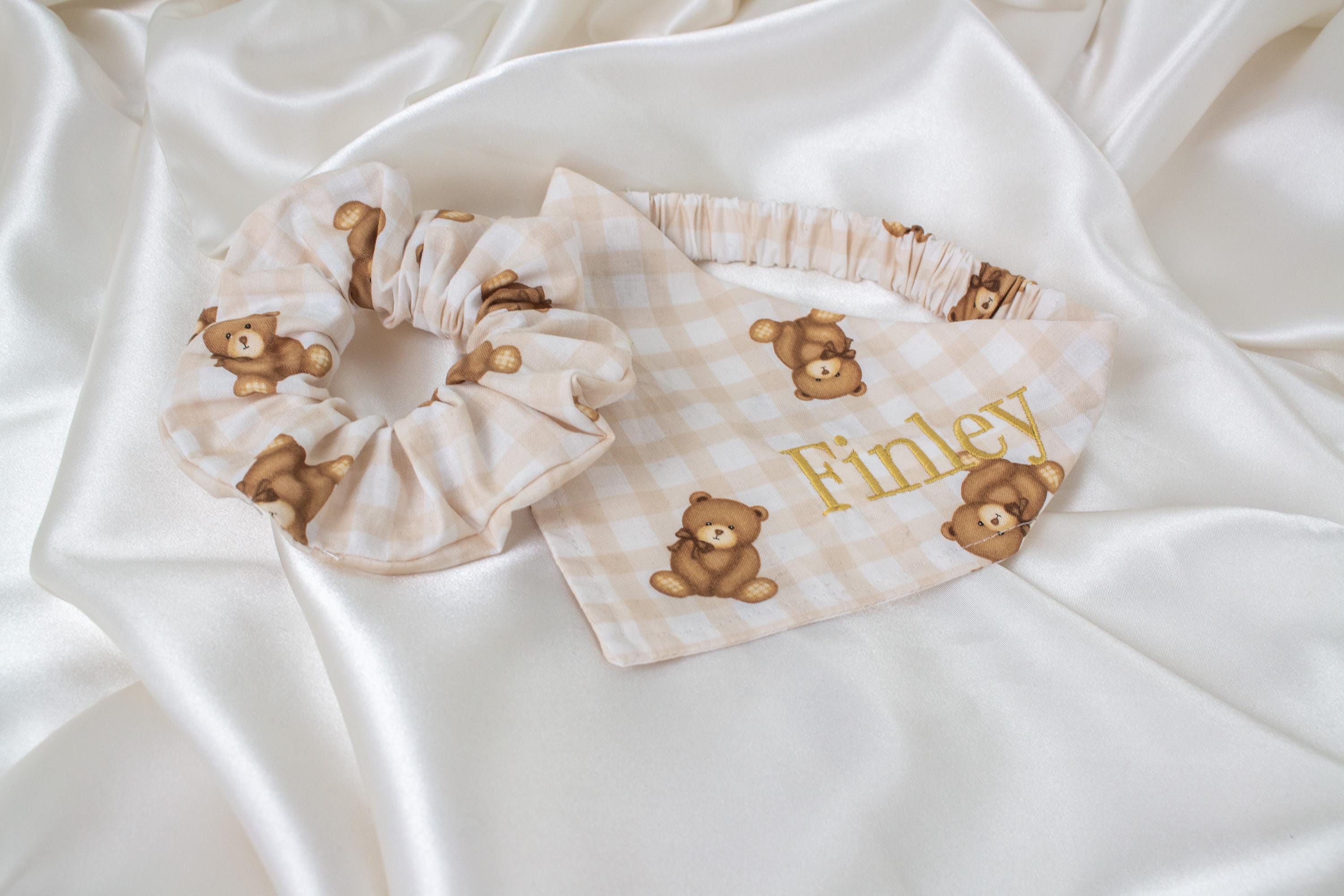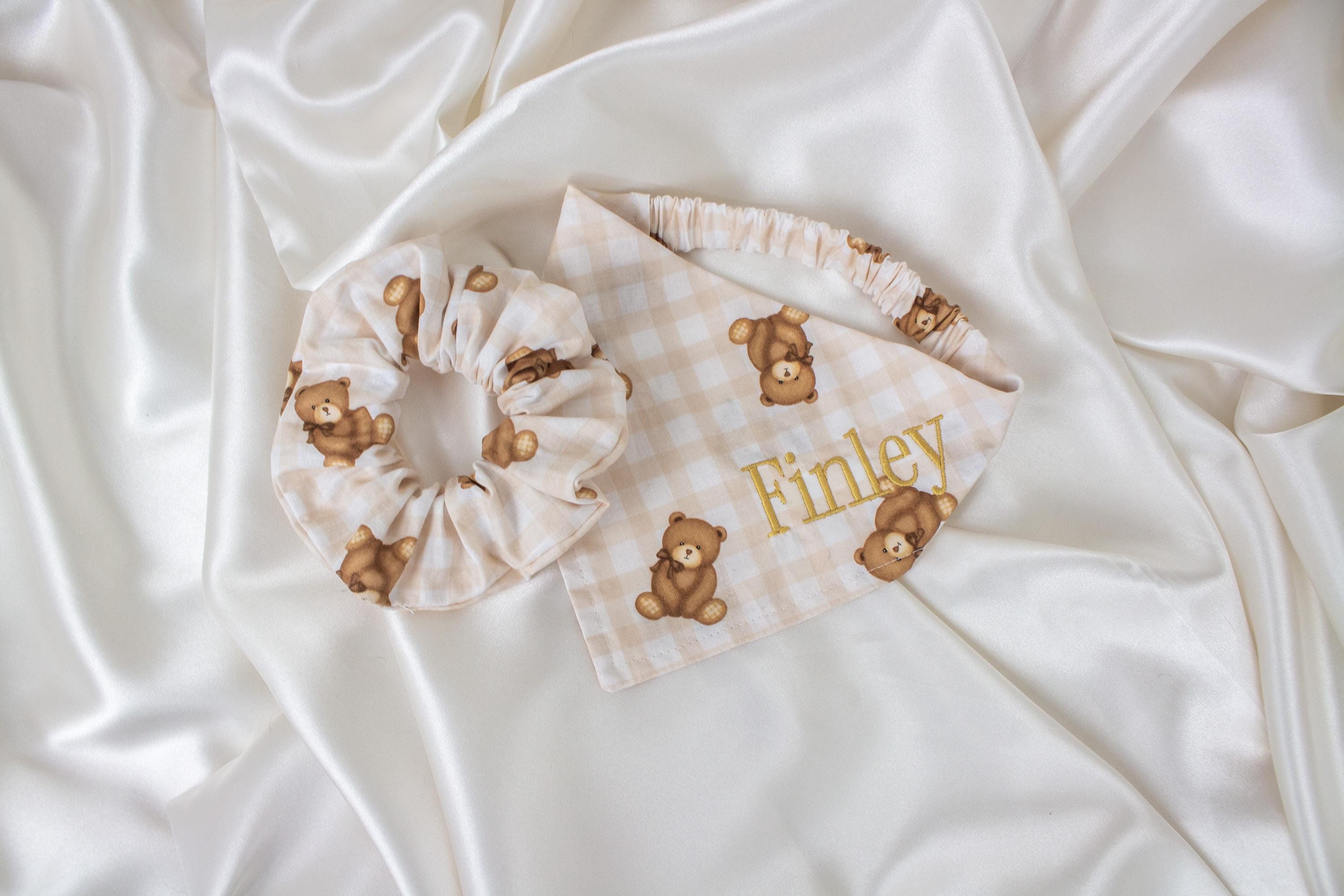 MATCHING Personalized Beige Gingham Teddy Bear Dog Bandana and Hair Scrunchie Set, Plaid Pet and Owner Pack, Dog Scarf with Gold Embroidered Name, Dog Gifts