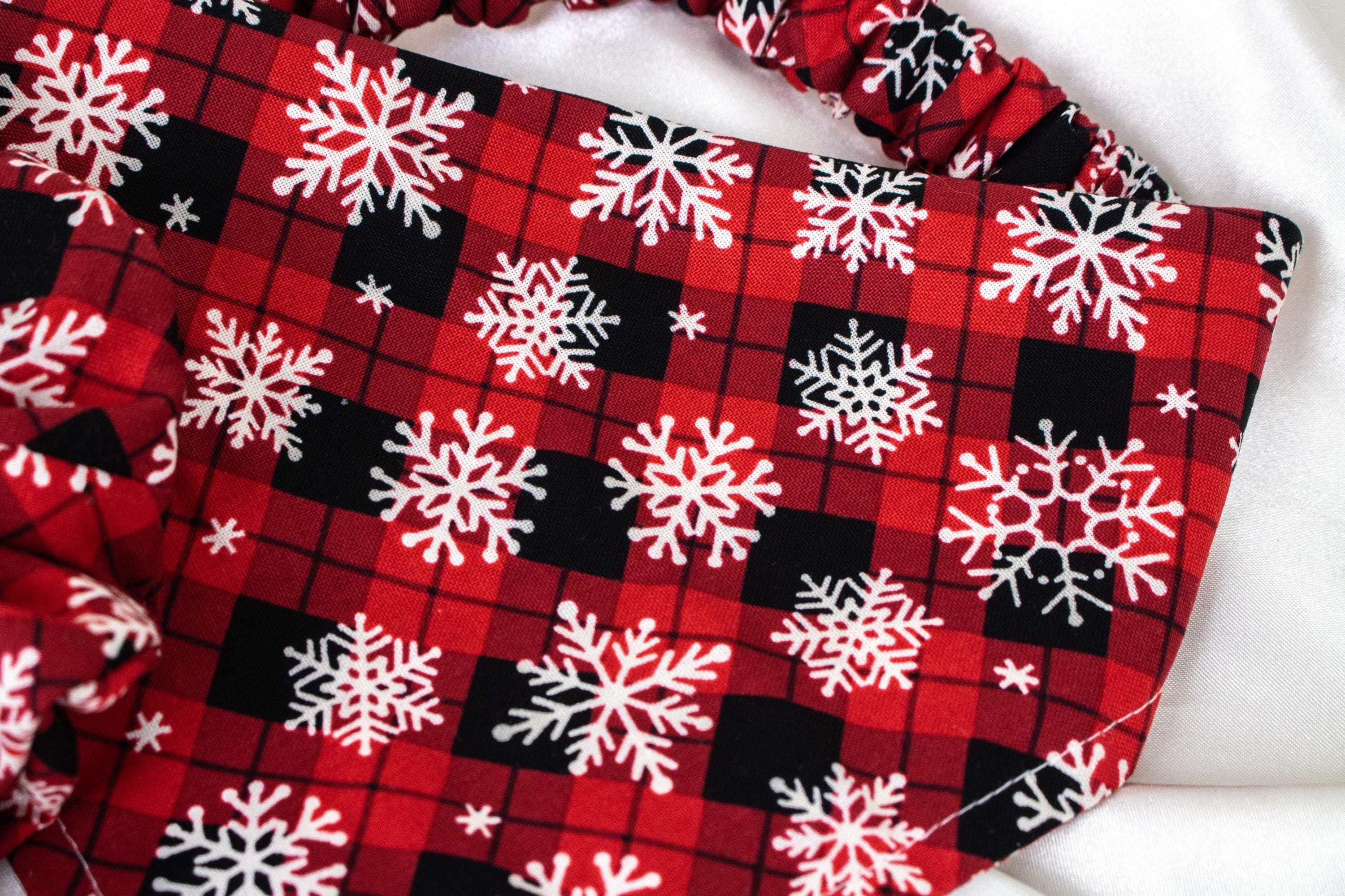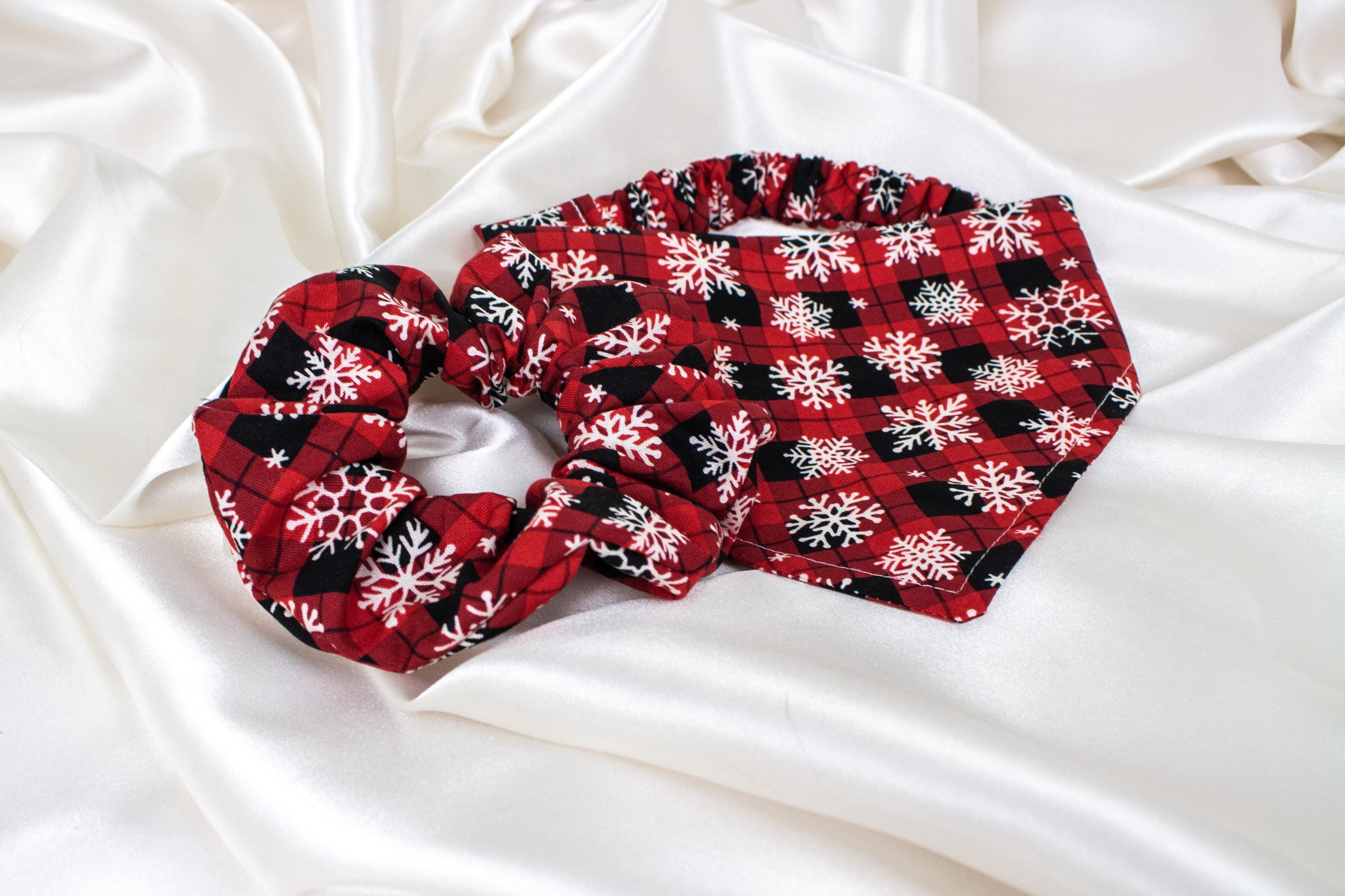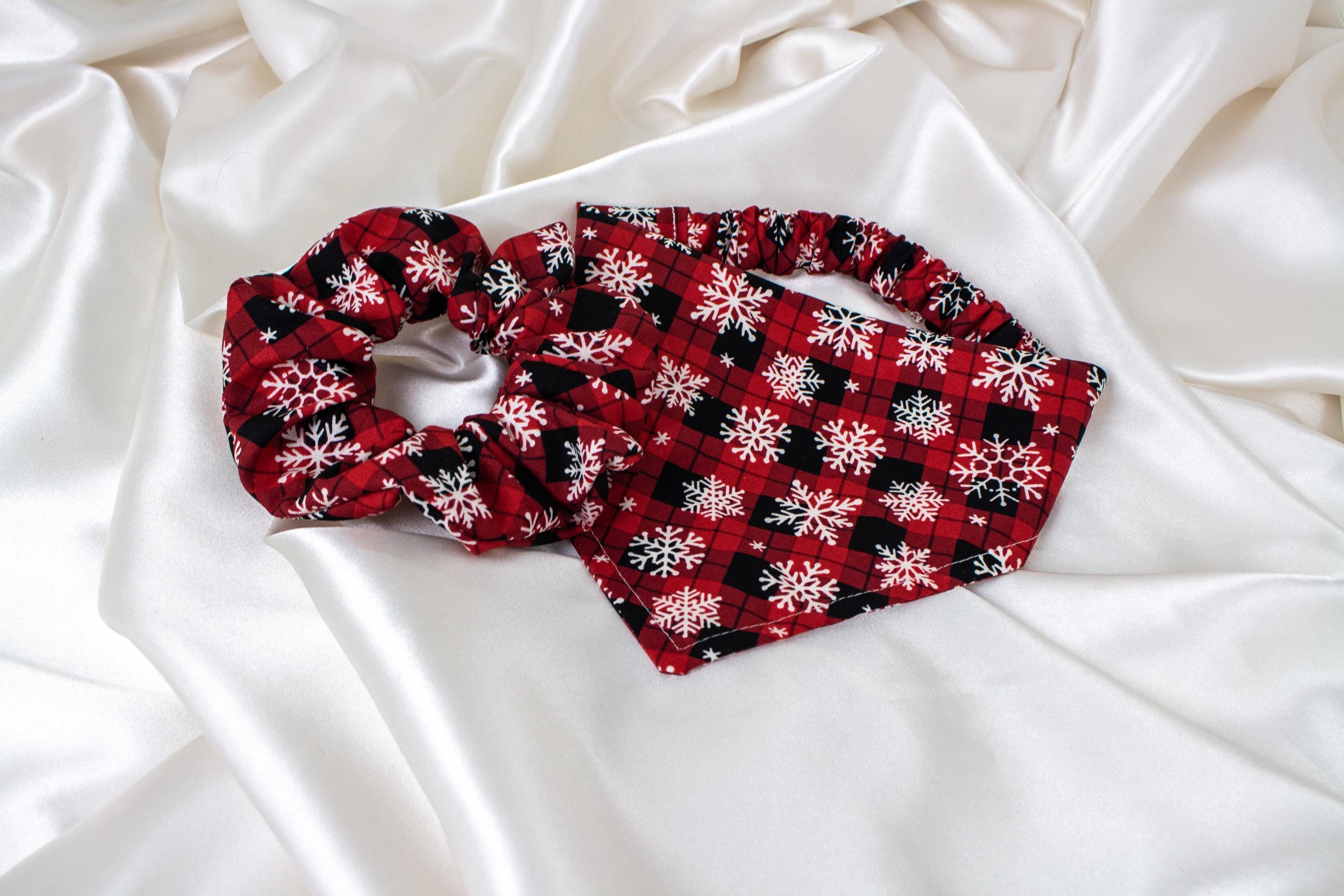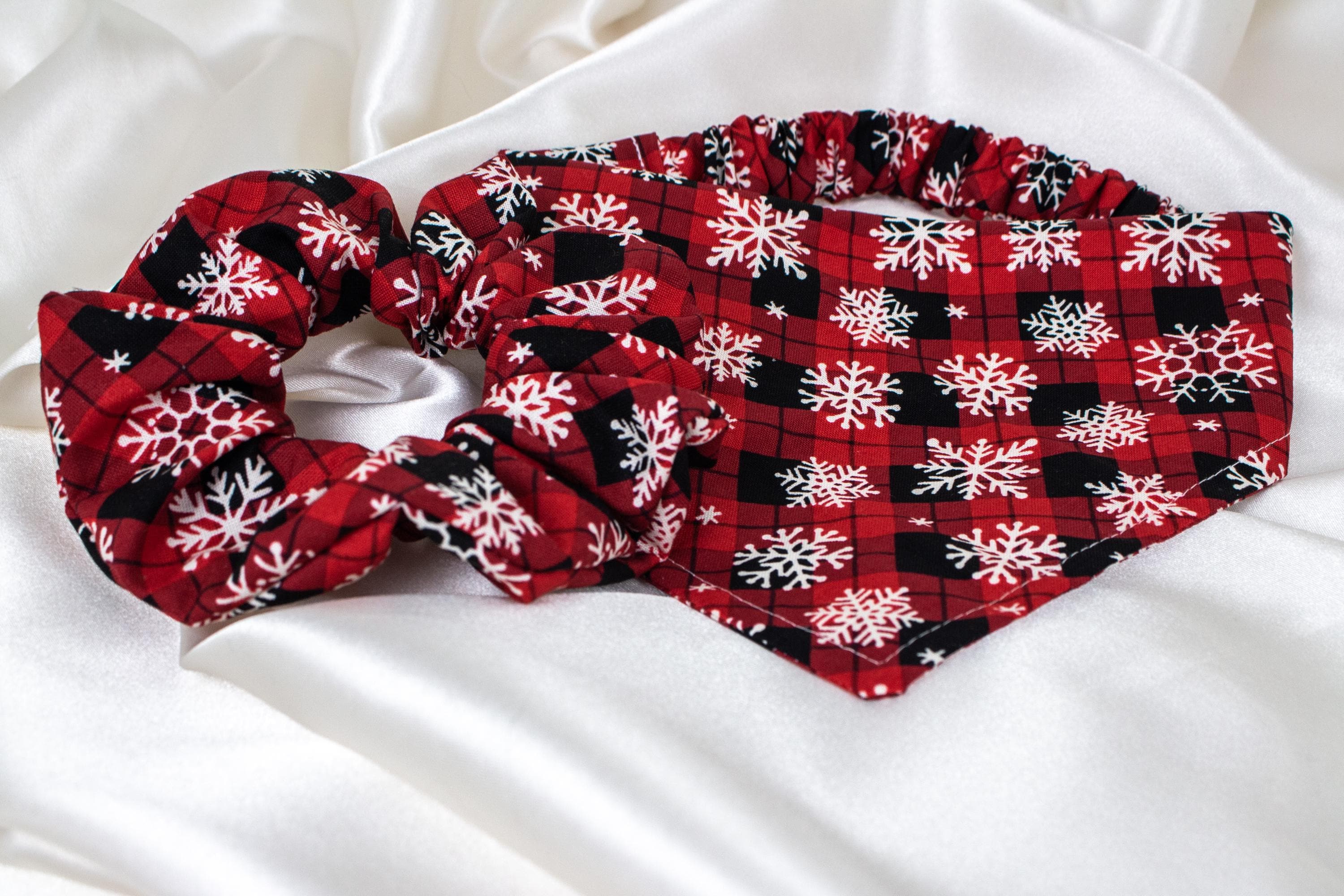 Matching Christmas Buffalo Plaid Dog Bandana and Hair Scrunchy Set with Winter Snowflakes, Holiday Scrunchie Pet and Owner Set, Festive Dog Scarf, Christmas Gifts